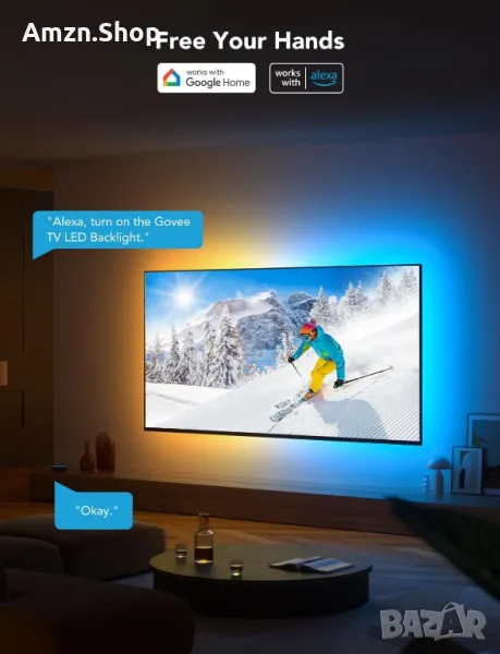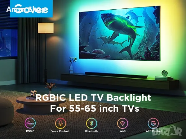 Симфония от RGBIC осветление: Технологията Govee RGBIC реализира цветния сегментиран дисплей на светлините отзад на телевизора, създавайки по-динамични и великолепни светлинни ефекти. Насладете се на по-живи цветове в светлините на вашия телевизор и надстройте своите визуални ефекти.Приложение и гласово управление: Управлявайте светлините на LED телевизора чрез приложение или интелигентно гласово управление с Alexa и Google Assistant. ( Моля, обърнете внимание, че няма да улавя цветовете автоматично и поддържа само 2.4G.)Множество предварително зададени сцени: Приложението Govee Home предлага 99+ предварително зададени сценични режима и 11 музикални режима, от които можете да изберете светлинните ефекти, които отговарят на вашето настроение или атмосферата около вас, за да подобрите гледането си.Синхронизиране на музика: Govee TV LED Backlight включва вграден микрофон, което прави цвета и яркостта синхронизирани с музиката. Насладете се на спиращи дъха светлинни ефекти, които танцуват с всяко аудио, сякаш сте на концерт.Гъвкава инсталация: Телевизионната подсветка от 12,5 фута може лесно да покрие 4 страни на всеки 55-65 инчов телевизор. Препоръчително е да използвате кабелните скоби, за да закрепите LED лентите на телевизора, за да прилягат плътно към вашите телевизори