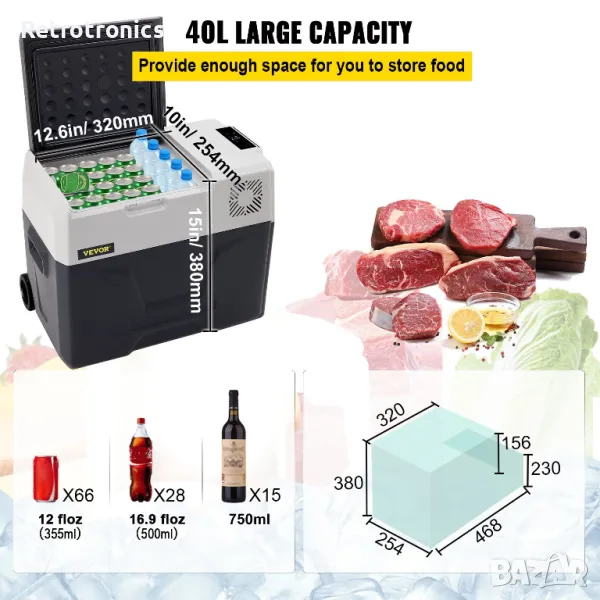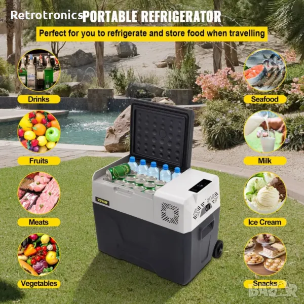 Продавам хладилник /фризер Vevor 40 литра. Състояние - чисто нов! Работи на 12/24 волта и на 110/220 волта с адаптер (включен в комплекта) Диапазон на охлаждане до -20 градуса. 3 нива защита на акумулатора. USB за зареждане на телефон, таблет и др. Блутут за управление от разстояние. Дисплей който показва реалната температура в хладилната част. Свръх тих инверторен компресор Перфектен за къмпинг, риболов, каравани, вила, камион, автомобил, лодка.
