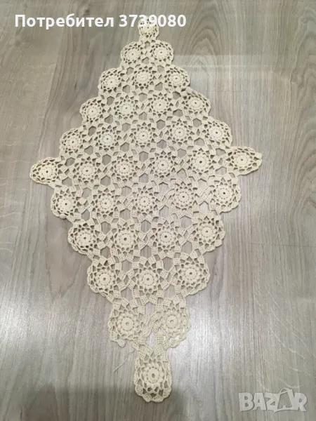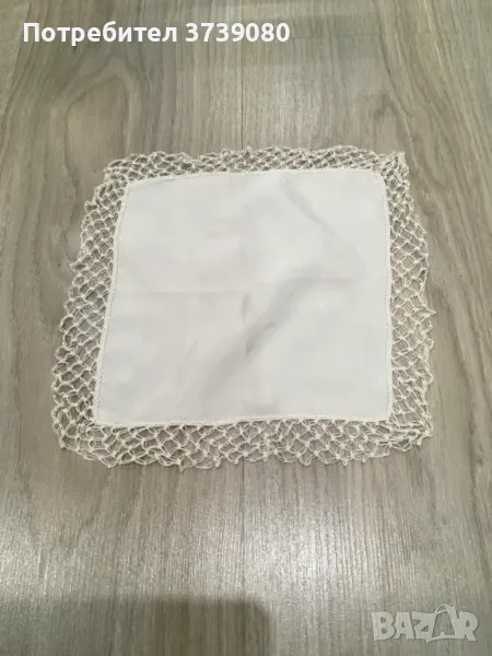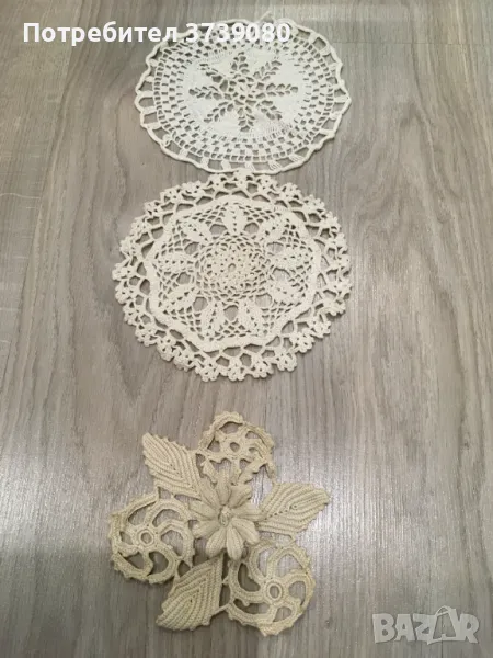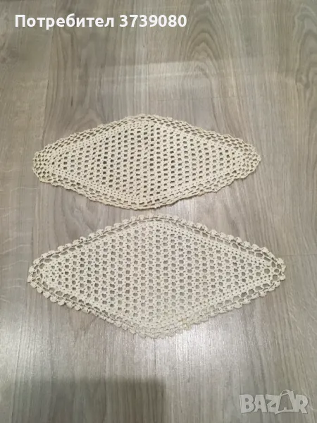 Снимка 1 голям кръг екрю диаметър 60 см! Снимка 2 ромб екрю 75/40 см! Снимка 3 ромб бяло 80/46 см! Снимка 4 и 6 31/20 см! Снимка 5 диаметър 30 см! Снимка 7 кръг цвете екрю 14 см,кръг малък бял 19 см! Кърпичка коприна 24/24 см! Отлично състояние! Цена за всички 35 еuro!