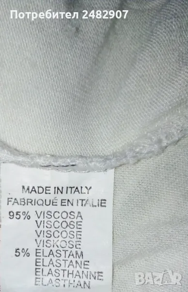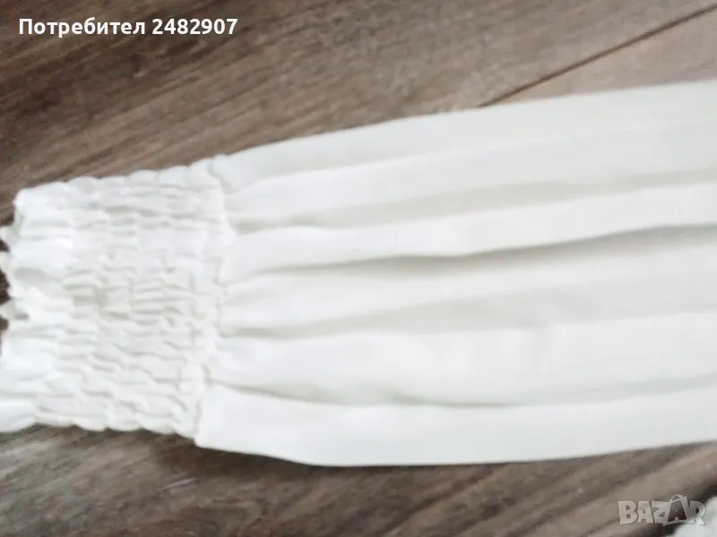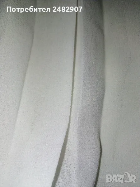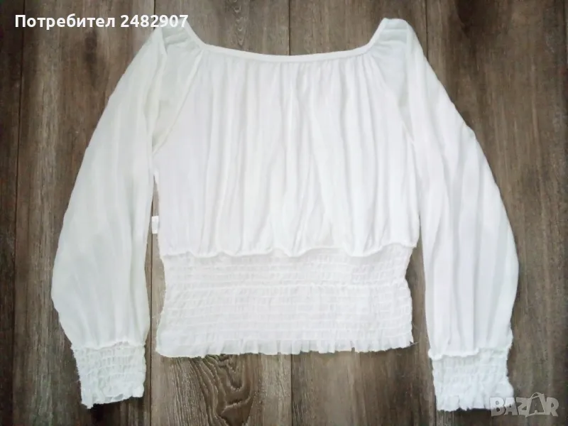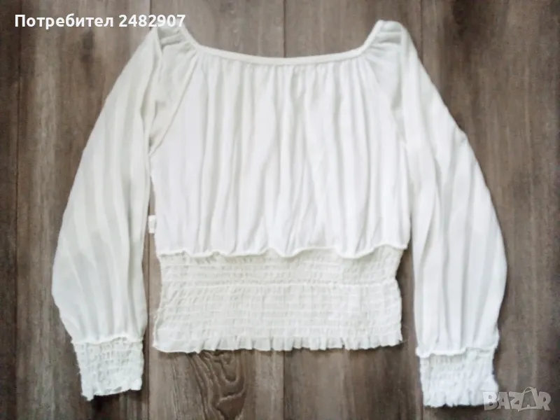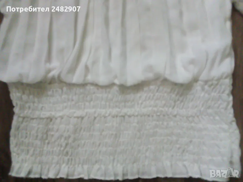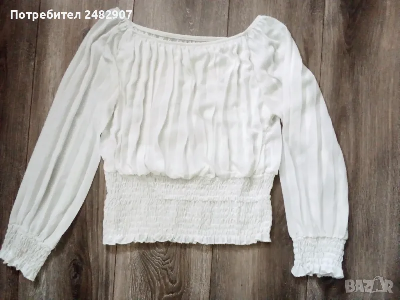 Къса бяла дамска блуза - плисе, универсален размер. Съдържа 95 % вискоза и 5 % еластан. Ширина в долната част - 34 см, дължина от рамото до долу - 49 см. Запазена, с нормални следи от употреба, с подплата, полупрозрачен ефект и ластик на ръкавите, деколтето и в долната част . Ръкавите са без подплата.