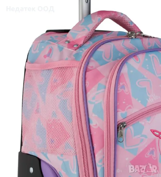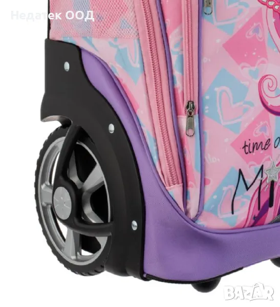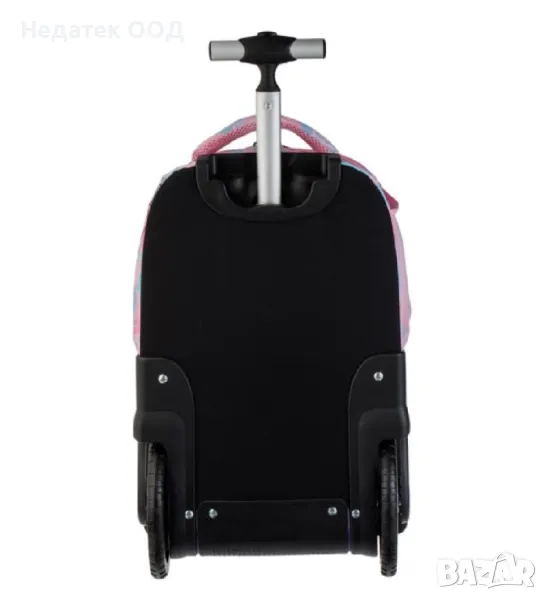 Ученическа чанта за количка с големи колела с диаметър 18 см, розово лилаво с шарка на еднорог. Разполага с 2 големи джоба и 1 допълнителен джоб отпред, 1 вътрешен многопозиционен вътрешен джоб и 1 джоб тип чантичка отстрани. С Т-образна дръжка до 99см.