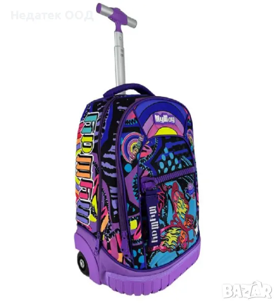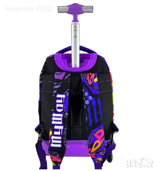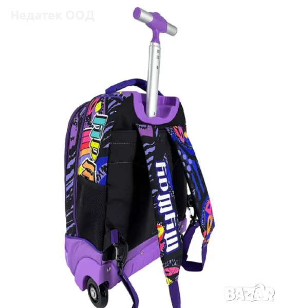 Ученическа чанта - количка, лилава с цветни шарки и червена пеперуда с пайети. Има 2 големи пространства, 1 преден джоб с голям цип и 1 страничен джоб с мрежа. С Т-образна алуминиева дръжка до 100 см, 2 колелца, поддържаща основа, меки ремъци, скрити в калъф и дръжка за носене.