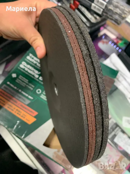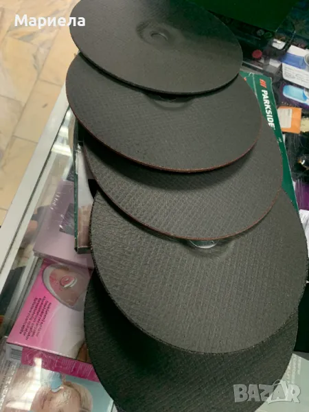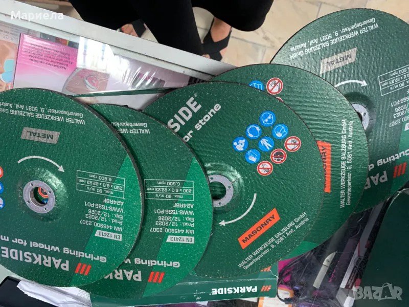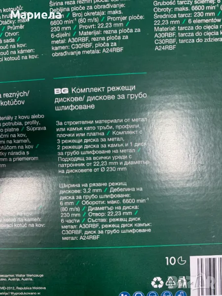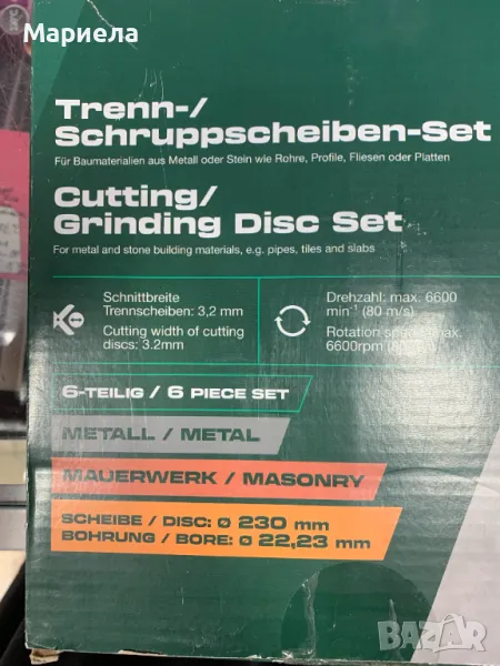 Комплекта съдържа 2 режещи диска за метал и 2 режещи диска за камък и 1 диск за грубо шлифоване на метал .