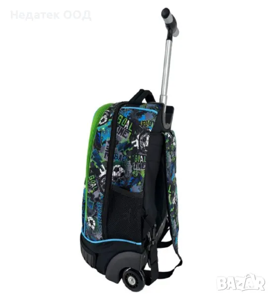 Ученическа чанта - количка, черен сиел с голям цип на предния джоб с дизайн на футболна топка. Има 1 голямо отделение, 1 джоб отпред с голям цип и 1 страничен с мрежа. С Т-образна алуминиева дръжка до 100 см, 2 колелца, поддържаща основа, меки ремъци, скрити в калъф и дръжка за носене.