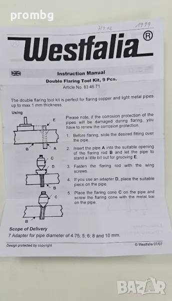 медни тръби 9ч., Westfalia, Германия. Подходящо за тръби с диаметър 4,75 ; 5,00; 6,00; 8,00; 10,0, 1/4 инча (6,35 мм) и 1/2 инча (12,7 мм) и дебелина до 1 мм.