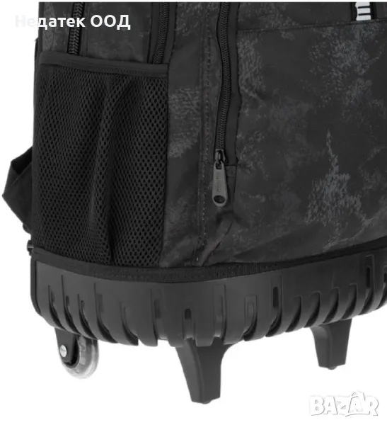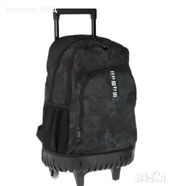 Ученическа чанта - количка, в черен цвят с армейски дизайн. Има 1 голямо и 1 по-малко отделение, 1 голям преден джоб, черен органайзер с цип и 2 странични мрежести джоба. Разполага с дръжка тип P до 81 см, 2 колела, опорна основа и меки презрамки.