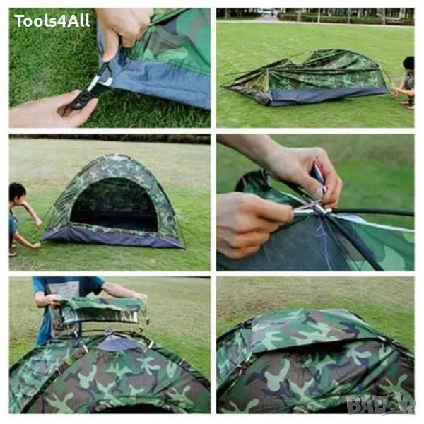 Насладете се на комфорта на природата с Четириместната камуфлажна палатка! Идеална за къмпинг, плаж или планина. Водонепромокаема, с просторно вътрешно пространство и лесна за разпъване. Включени са всички необходими аксесоари.