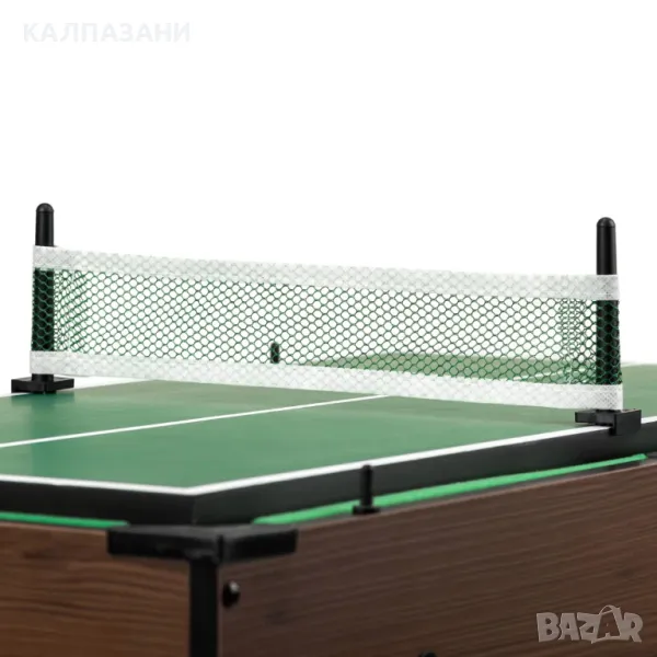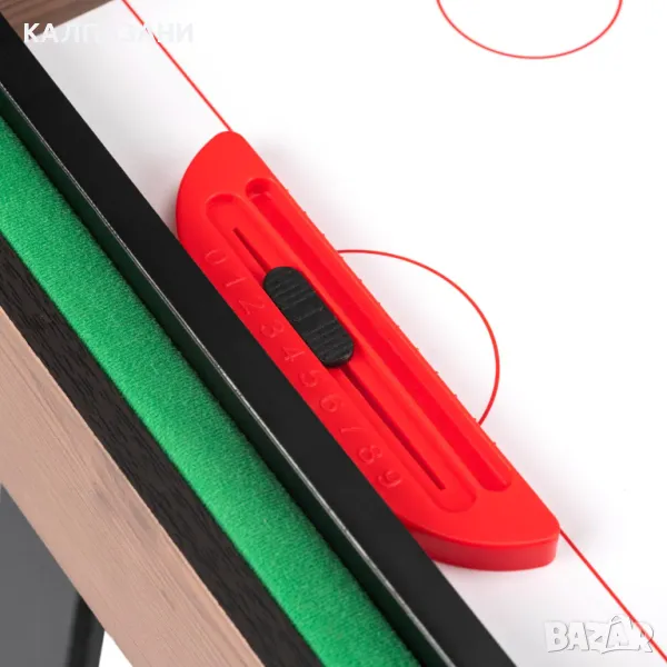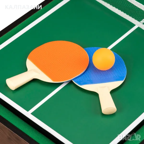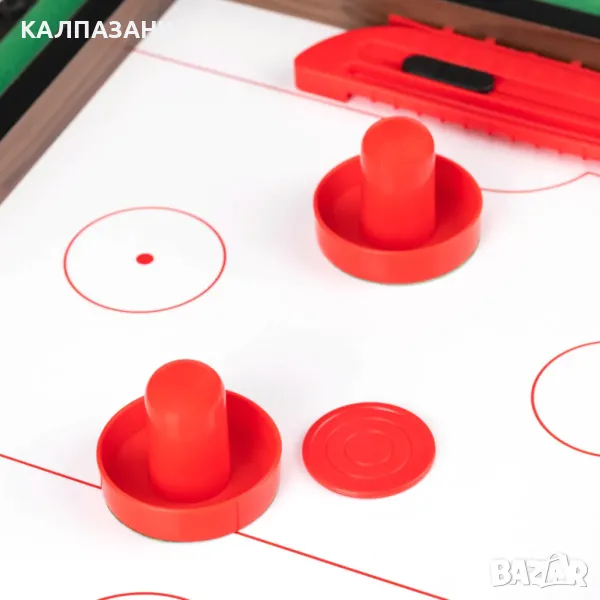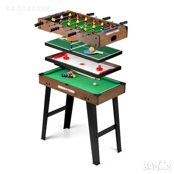 Масата включва всичко необходимо, за да започнеш с всяка игра. Футболната маса идва с 2 топчета, идеални за двама играчи да се състезават един срещу друг. Хокейната игра включва 2 шайби и 2 тласкача, осигуряващи бързо и вълнуващо игрово изживяване. Билярдната игра се предлага с 2 щеки, 16 топки, триъгълник, четка за маса и тебешир. Играта за тенис на маса включва 2 хилки, 2 топки и мрежа, което гарантира, че можеш да се насладиш на страхотна игра на пинг-понг с приятел.