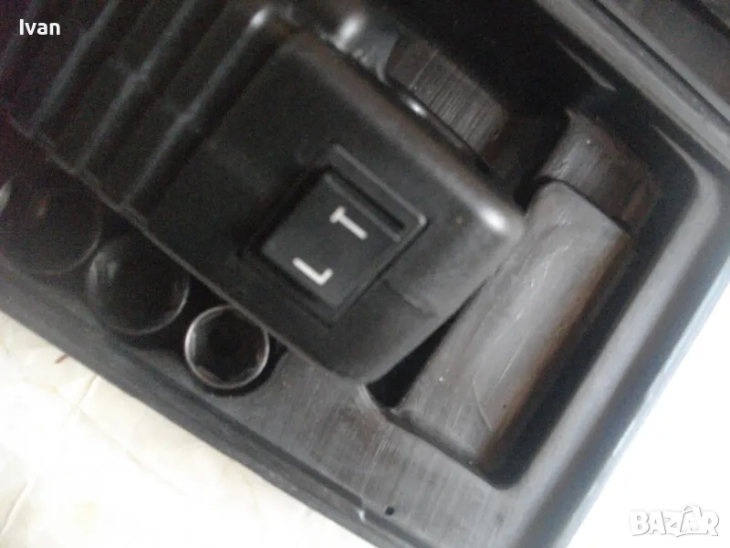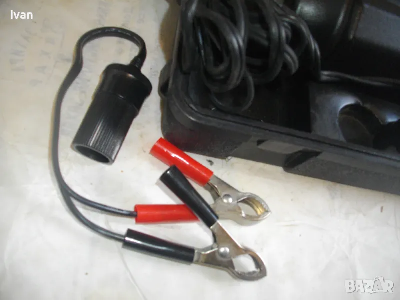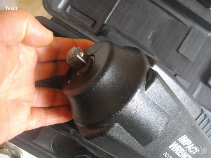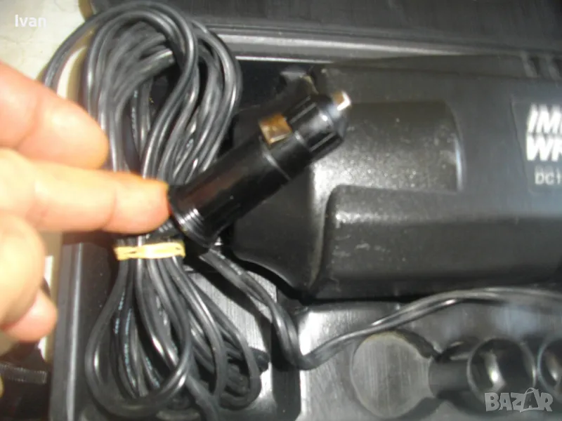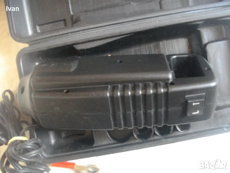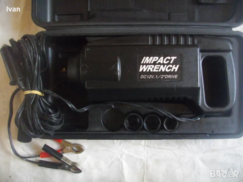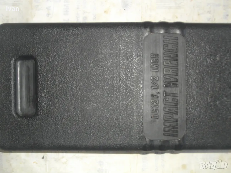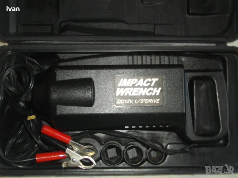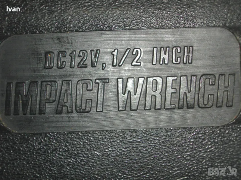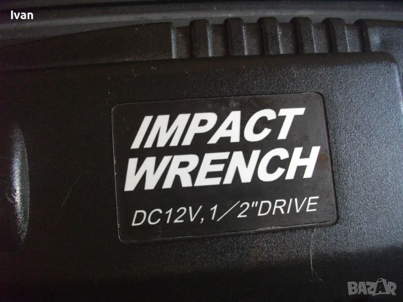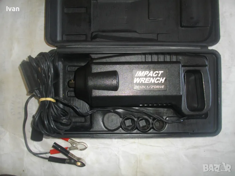 ОПИСАНИЕ на 12 волтов акумулаторен голям черен гайковерт импакт в куфар с вложки за скачване към акумулатор или запалка на автомобил. Силен и мощен 12 волтов гайковерт за натягане на болтове/гайки на автомобили/камиони/бусове. 1/2 зохват на квадрата, със съчма. Производство - Тайван/Made in Taiwan. Липсва фабричния стикер с техн.данни. Много запазен външен вид на машината и куфара, почти нови. Добро техническо/работно състояние. Машината е пробвана - работи добре, върти силно на 12 волтов акумулатор, реверса смяна посока също работи добре. Размери на гайковерта - 280 х 120 х 80 мм. Голяма професионална дължина на захранващия кабел с извод/букса за скачване към запалката на автомобил - 5 м.