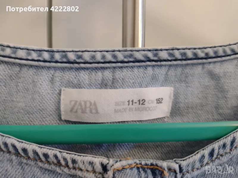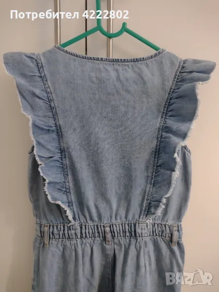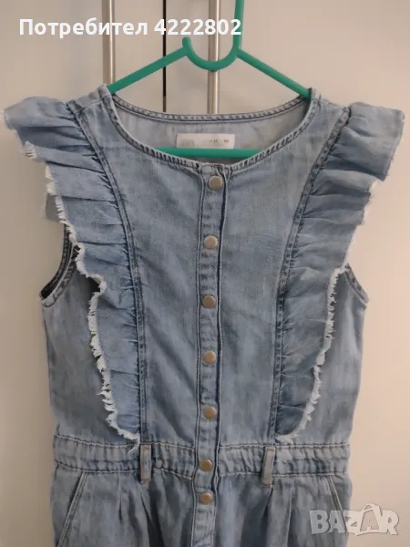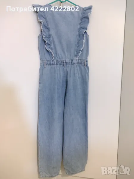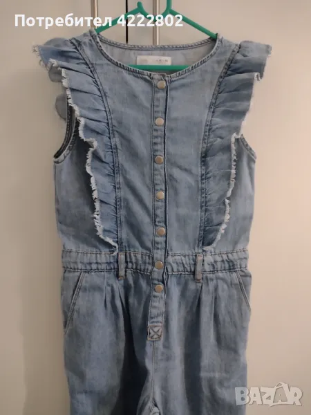 Дънков детски гащеризон Zara, размер 11-12 години (152 см). С ластик на талията, два джоба отпред и къдрици отпред и отзад. Дължина - 116 см, ширина подмишници - 37,5 см. В отлично състояние.