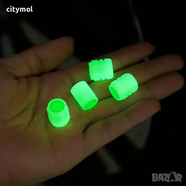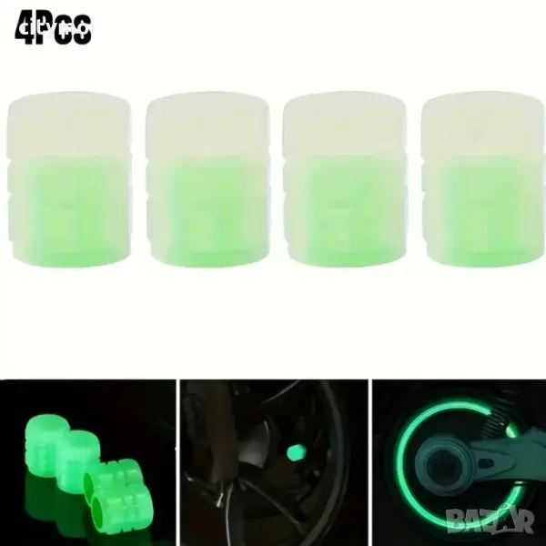 Луминесцентните капачки за вентили светят в тъмното и служат като красиво средство за допълнителна безопасност през нощта. Става за коли, мотоциклети, велосипеди и други превозни средства със стандартен вентил. Капачките светят със собствена светлина, не изискват батерии. Комплектът включва 4 капачки.