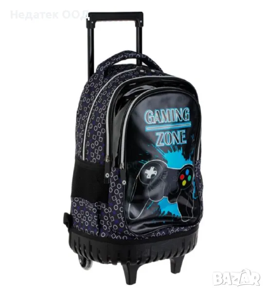 Ученическа чанта - количка черна с дизайн gaming zone. Има 2 големи джоба и 1 преден, двоен цип и 2 странични джоба за чанта с черна мрежа С дръжка тип P до 82 см.