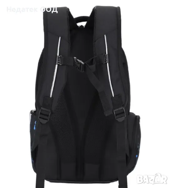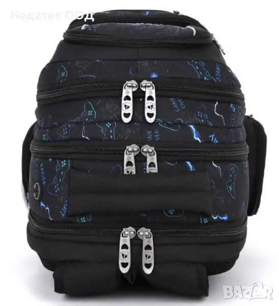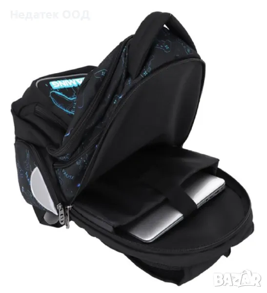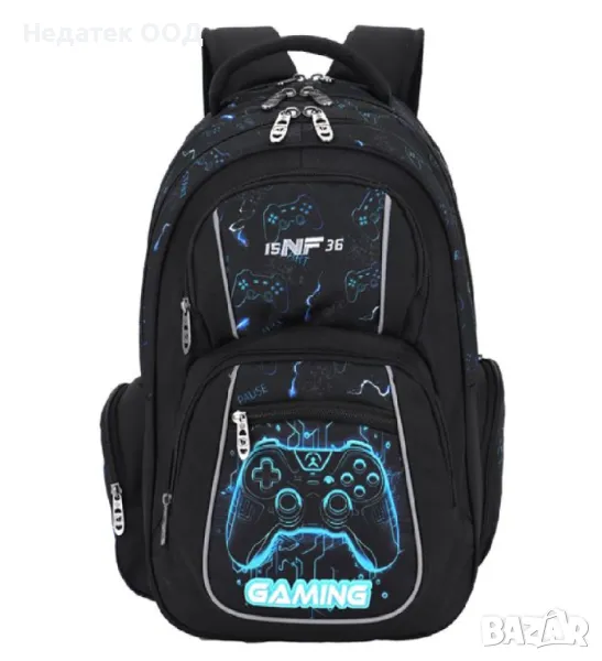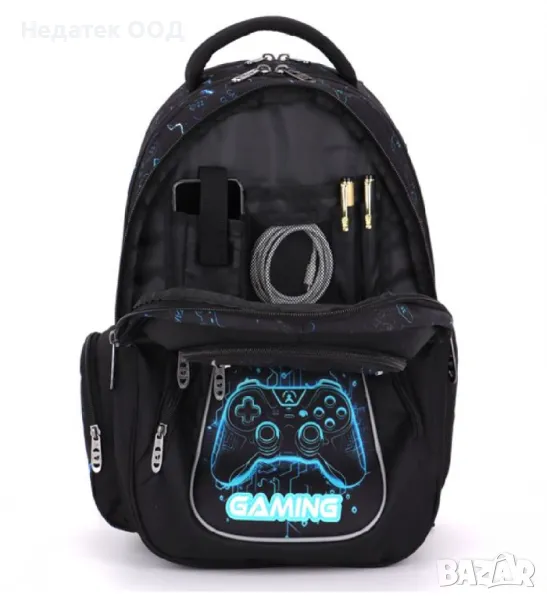Ученическа раница за игрална конзола в черно със сини детайли и надпис "Gaming". Има 3 джоба със здрави ципове и метални закопчалки и 2 странични джоба за монети с цип. Голямо подсилено отделение за лаптоп, интегрирано в основното отделение. Има джоб за организация, отвор за лесно свързване на слушалки, място за съхранение на очила в предния джоб и светлоотразителни ленти от всички страни. С анатомичен гръб, ергономични презрамки, дръжка и качествено водоустойчиво дъно.