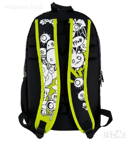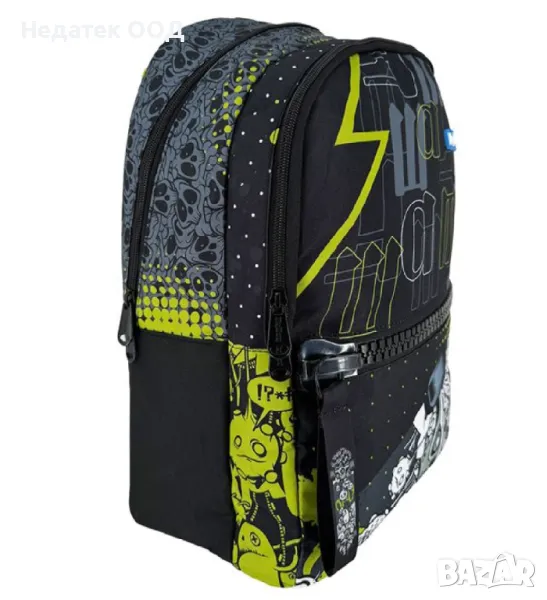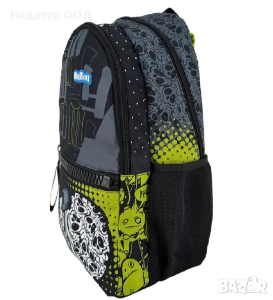 Ученическа раница, черно каки с дизайн на скейтборд с череп. Има 2 големи пространства, 1 преден джоб с голям цип и 1 страничен джоб с мрежа. Има мек гръб, дръжка и регулируеми презрамки.