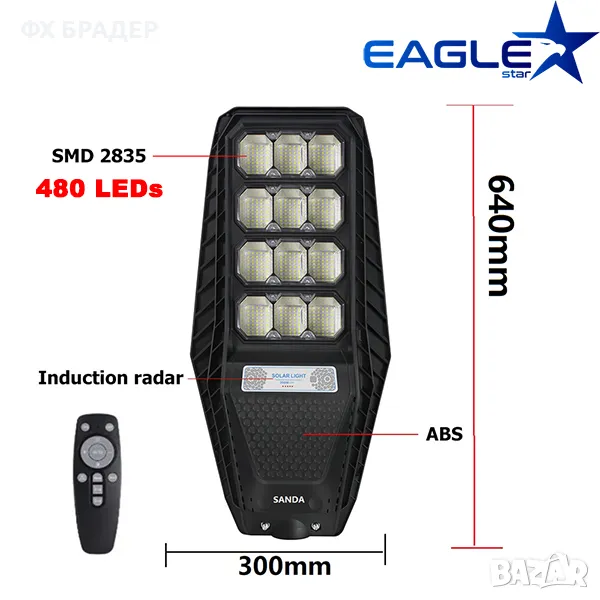 промоция! Соларна улична лампа РIR сензор,дистaнционно,480 LED,200W → Обява 47136836
