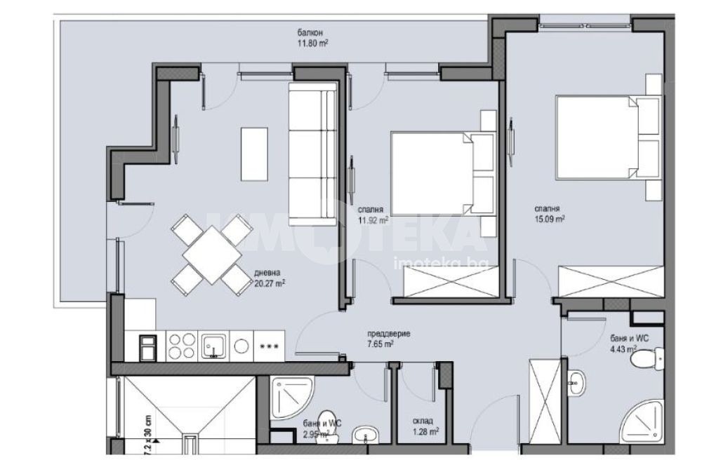 Тристаен апартамент със застроена площ от 83,38 кв.м. Състои се от: дневна с кухненски бокс, две спални, две бани, преддверие, склад и балкон. Изложението е запад. Има възможност за закупуване на подземно паркомясто.