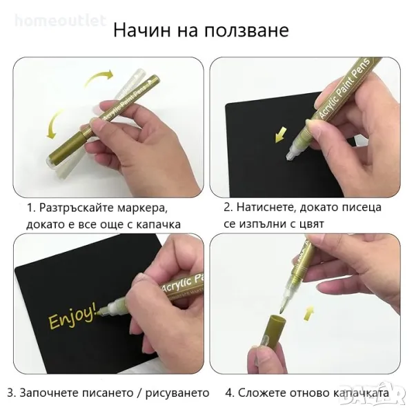 Перманентните маркери са подходящи за рисуване върху черен картон, скална живопис, рисунка с камъчета, пластмаса и др.