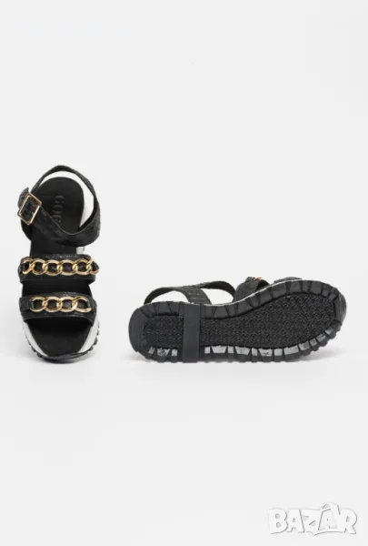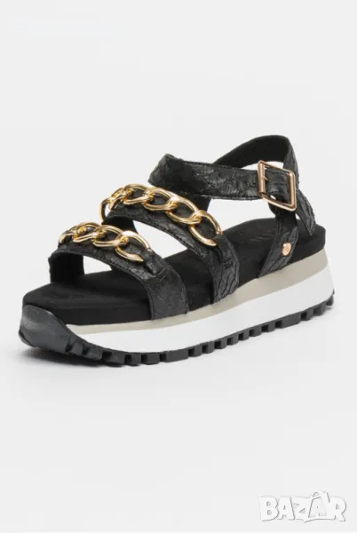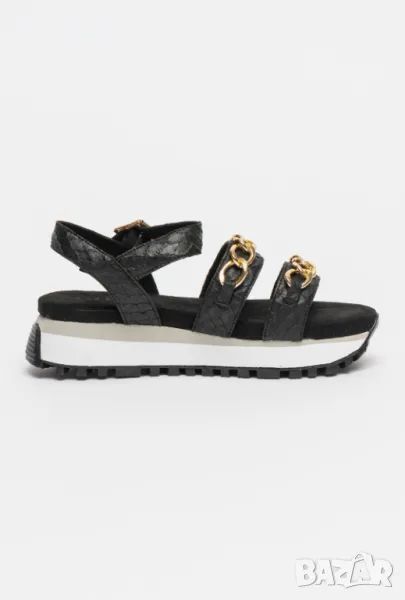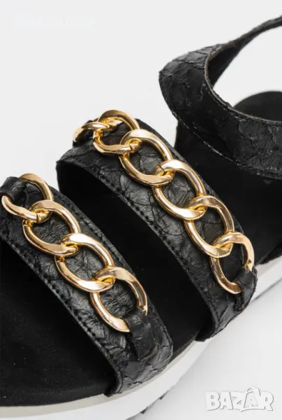 Продавам нови сандали с етикет, подходящи и за подарък. Тип - платформа, цвят - черен, материал - екологична кожа. Детайли : декоративна верижка, детайли от еко змийска кожа с закопчаване - катарама. Размер 40 стелка 26см.