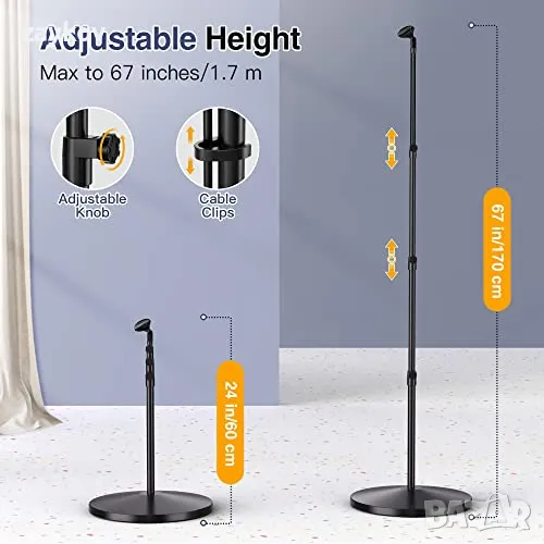 Височината на стойката за микрофон се регулира от 24 инча до 67 инча, което ви позволява лесно да настроите желаната височина чрез регулиране на съединителя. Освен това включената скоба за микрофон може да се върти на 180°, което прави тази стойка за микрофон по-гъвкава и практична.