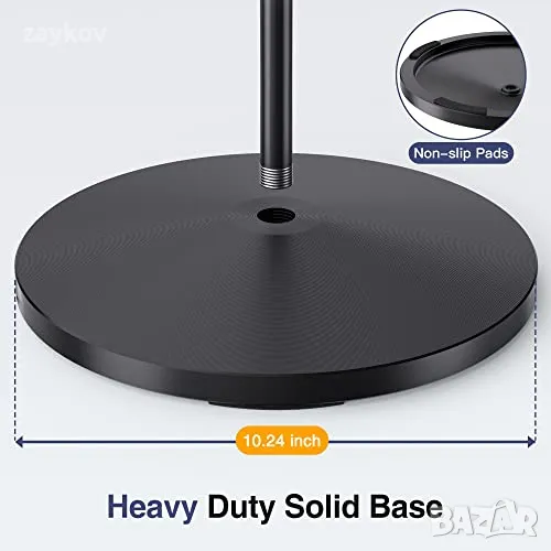 стойка за микрофон е направена от солиден лят метал с диаметър 10,24 инча и тегло 5,64 lbs. За допълнително подобряване на стабилността и избягване на мърдане, основата разполага с неплъзгащи се подложки на дъното.