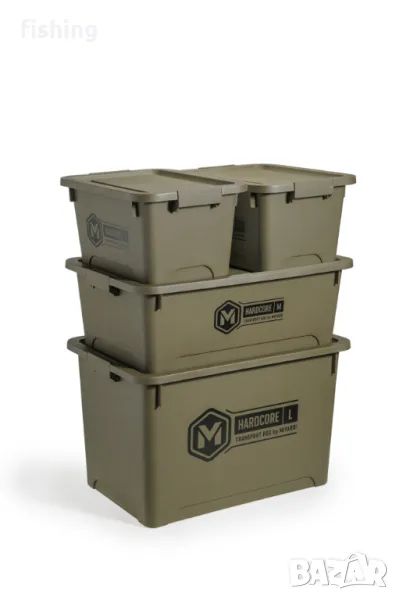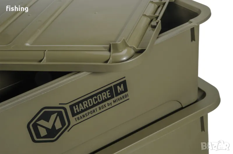 Hardcore Transport Box предлага надеждно и сигурно решение за транспортиране и съхранение не само на риболовно оборудване, но и на всички неща на открито. Тези заключващи се, издръжливи и подреждащи се кутии се предлагат в три размера. Осигуряват перфектна организация и ред край водата, по време на транспорт или в гаража. Основно предимство е техният "хардкор" дизайн. Здравата, удароустойчива пластмаса издържа на механични повреди. Специално оформеният капак е снабден с подсилващи жлебове, които спомагат за стабилното подреждане на кутиите. Капакът с нисък профил следва горния ръб на кутията и не стърчи ненужно, предотвратявайки загубата на място при подреждане на няколко кутии. Здравите ключалки на капака са лесни за работа и не пречат, дори когато боравите с отворена кутия без капак. Когато са затворени, ключалките сигурно държат капака на място, дори при удари или когато кутията е преобърната. Празните кутии са лесни за съхранение, тъй като пасват една в друга. Големите и средните кутии споделят еднакъв отпечатък и се различават само по височина. Средната кутия е идеална за плъзгане под легло поради височината си. Малката кутия има половината отпечатък и е идеална за по-малки аксесоари, в лодка или като кутия за стръв.