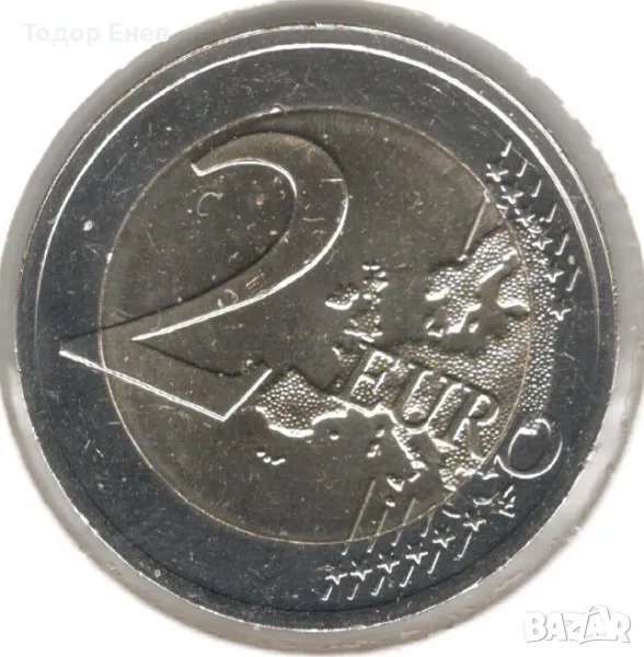 A geographical map of Western Europe spans the outer ring and inner core on the right side of the coin. The inscription 2 EURO is superimposed over the map of Europe, with the numeral “2” located in an open field representing the eastern Atlantic Ocean. 12 stars are located on the right side of the outer ring, with six stars atop the map of Europe and six stars below it; six vertical stripes cut across the inner core of the coin, visually connecting the upper and lower star segments.