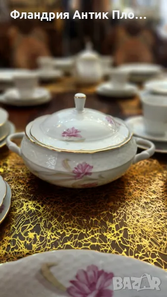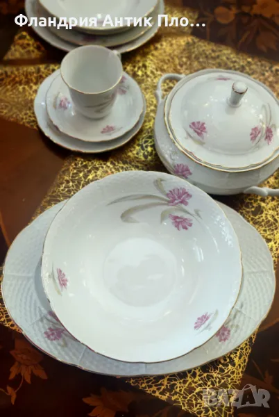 Този изискан старинен сервиз за хранене и чай, изработен от марката Thun в прочутия регион Карлсбад (Чехословакия), е истинско съкровище за любителите на класическия порцелан. Сервизът е създаден от фин бял порцелан и е украсен с нежни розови цветя, които придават на всяко изделие изтънчен и романтичен вид.