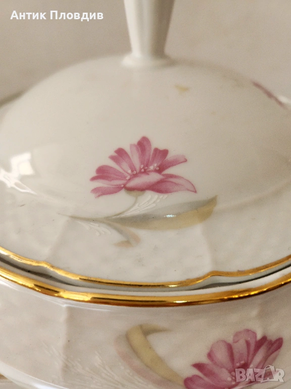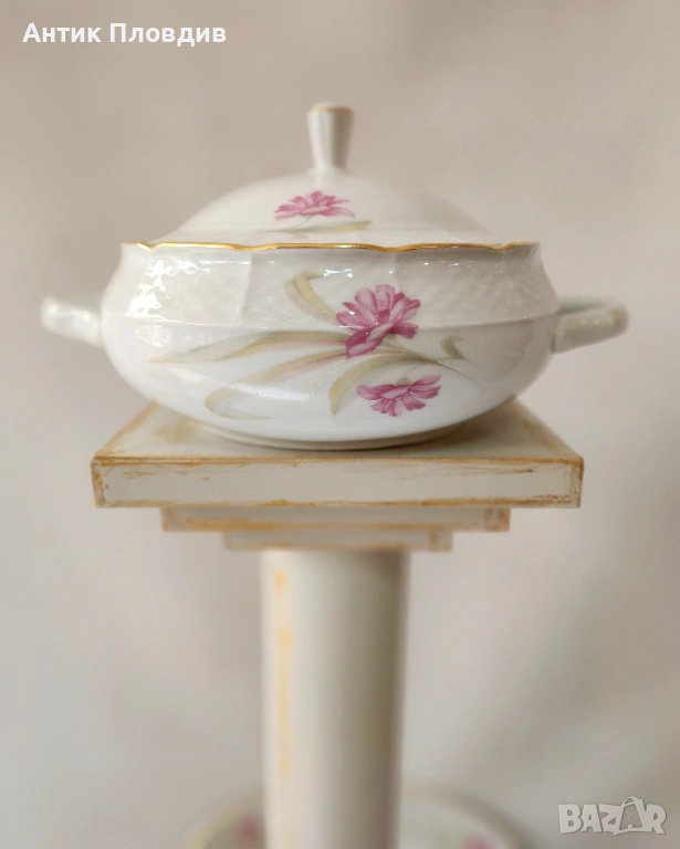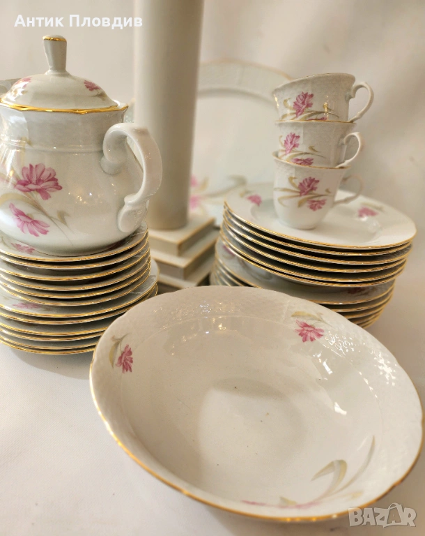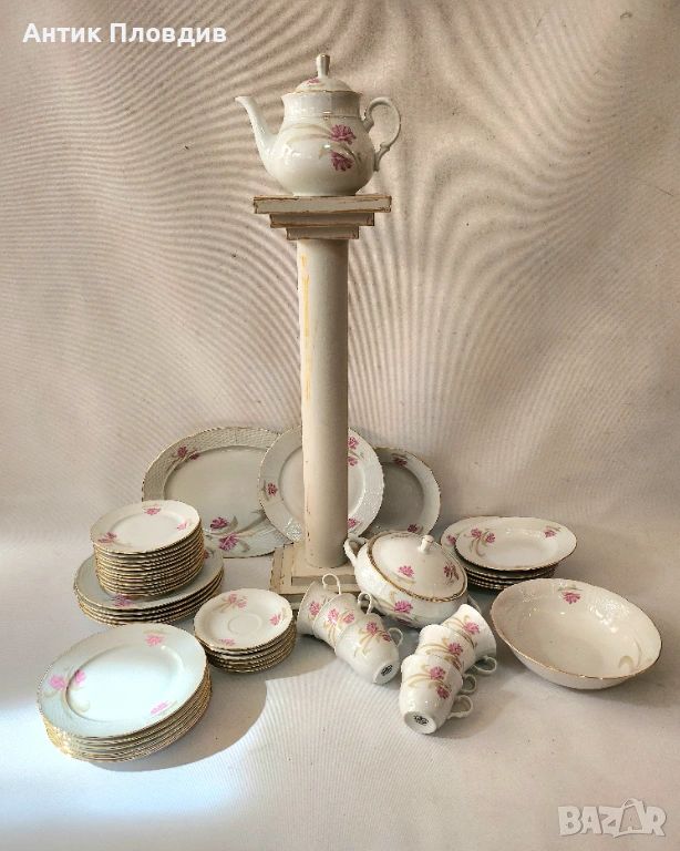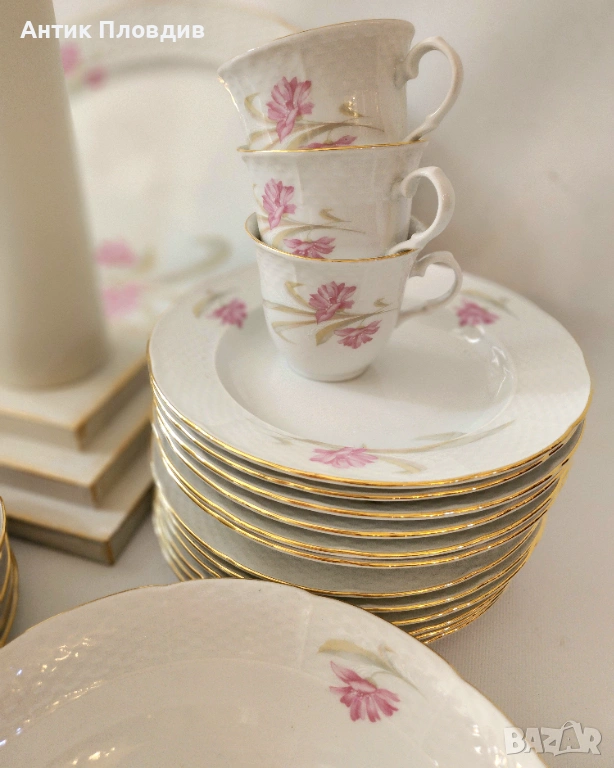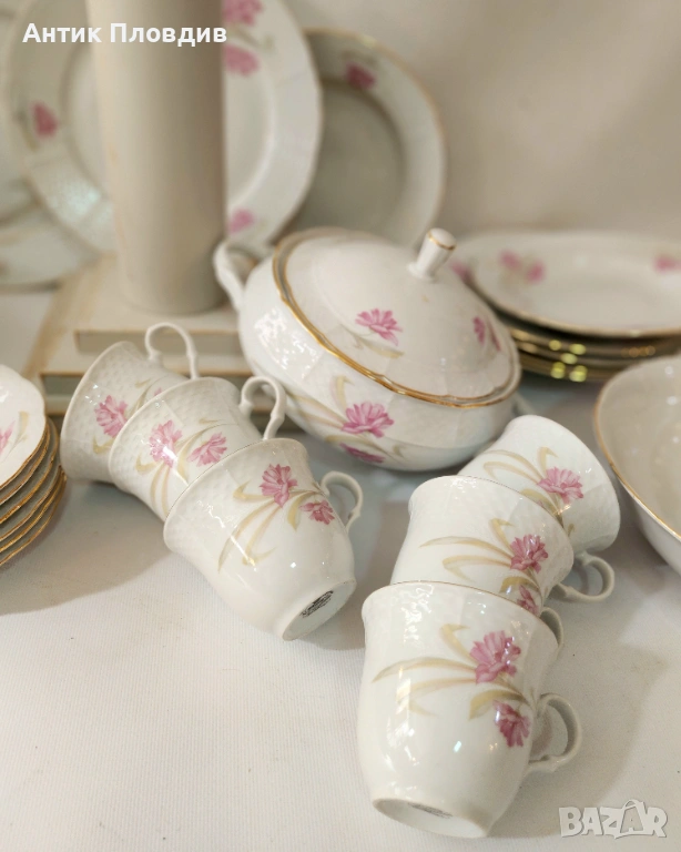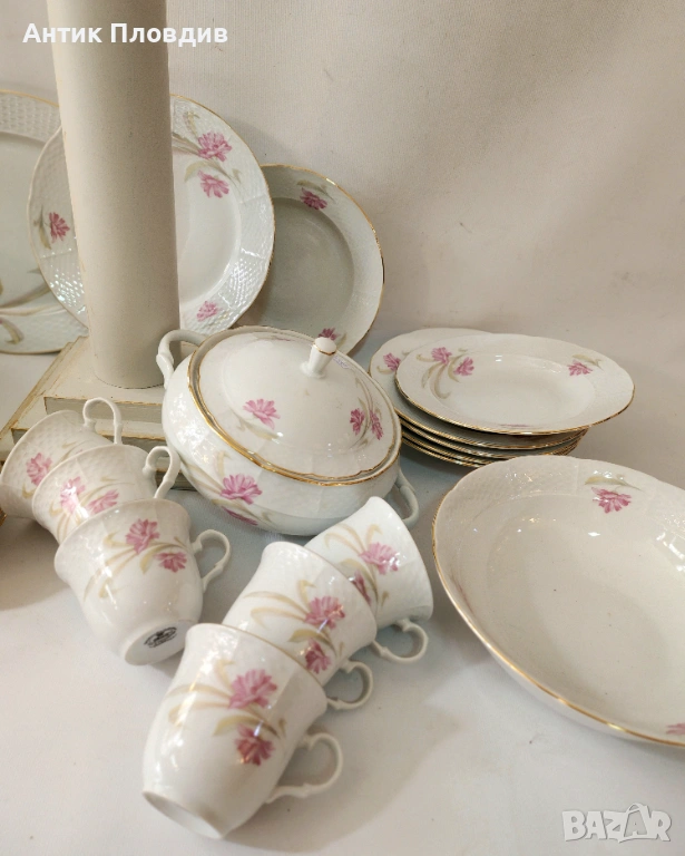 Този изискан старинен сервиз за хранене и чай, изработен от марката Thun в прочутия регион Карлсбад (Чехословакия), е истинско съкровище за любителите на класическия порцелан. Сервизът е създаден от фин бял порцелан и е украсен с нежни розови цветя, които придават на всяко изделие изтънчен и романтичен вид.
