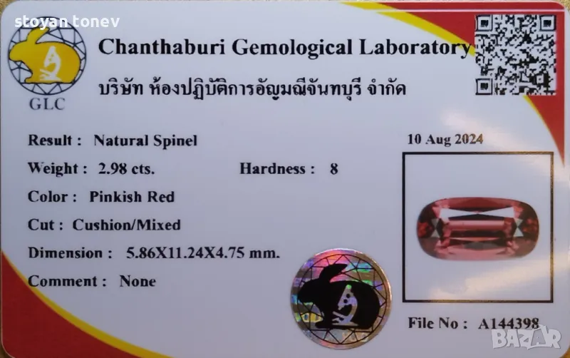 Този камък е 2.98 карата натурален необработен (unheated) шинел от Мянмар (Burma/Myanmar), сертифициран от Chanthaburi Gemological Laboratory (GLC/GLCLC) – тайландска лаборатория от Чантабури (Gem Capital на Тайланд), която е приемлива за идентификация на спинели (натурален + no treatment), особено за азиатския пазар, но не е от глобалните топ (GIA, GRS, AGL). Сертификатът потвърждава натурален, без обработка, pinkish red цвят, cushion/mixed cut, и няма коментари за включения (предполагам VS чистота – eye-clean или близо до VS, минимални включения).