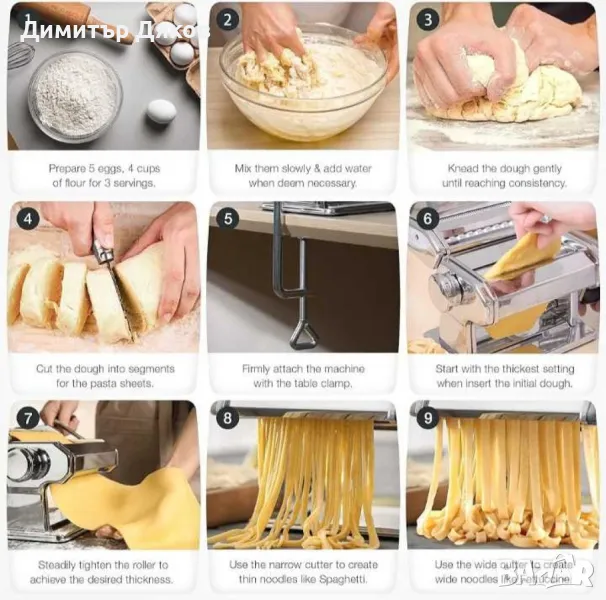 В комплекта са включени ръчна манивела и скоба с пластмасови дръжки Скоба за монтаж на машината за паста върху кухненски плот Почиствайте редовно стъргалата под гладките валове с домакинска хартия или суха кърпа, никога не мийте машината с вода или в съдомиялна машина