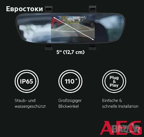 Опростено паркиране. Огледалото за обратно виждане AEG SR5 безжично предава условията на трафика директно в интериора на автомобила и по този начин позволява безопасно паркиране и маневриране на автомобили, SUV, кемпери и ремаркета. 5-инчовият (12,7 cm) LCD монитор на огледалото получава сигнала за изображение от задната камера. Камерата за задно виждане осигурява ъгъл на видимост от 110° и има степен на защита от прах и вода IP65.