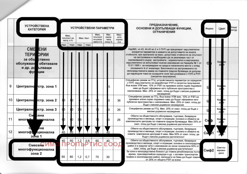 Параметрите на застрояване на имотите в зона Смф2 са следните: