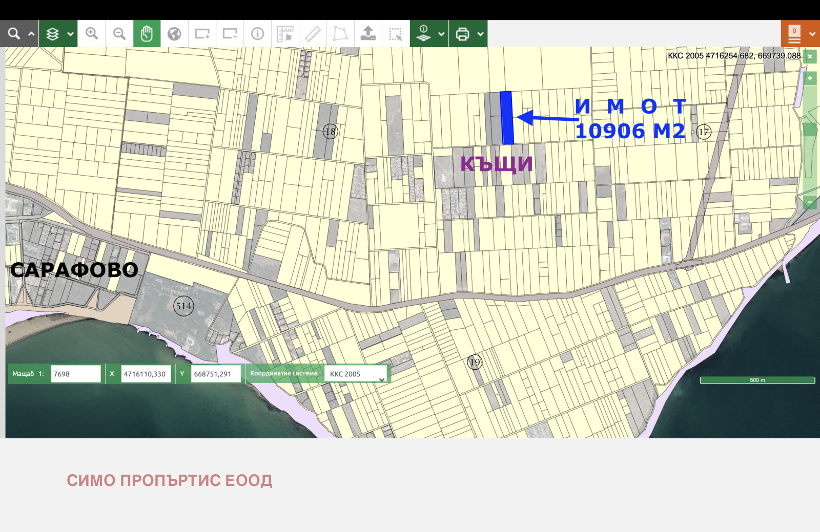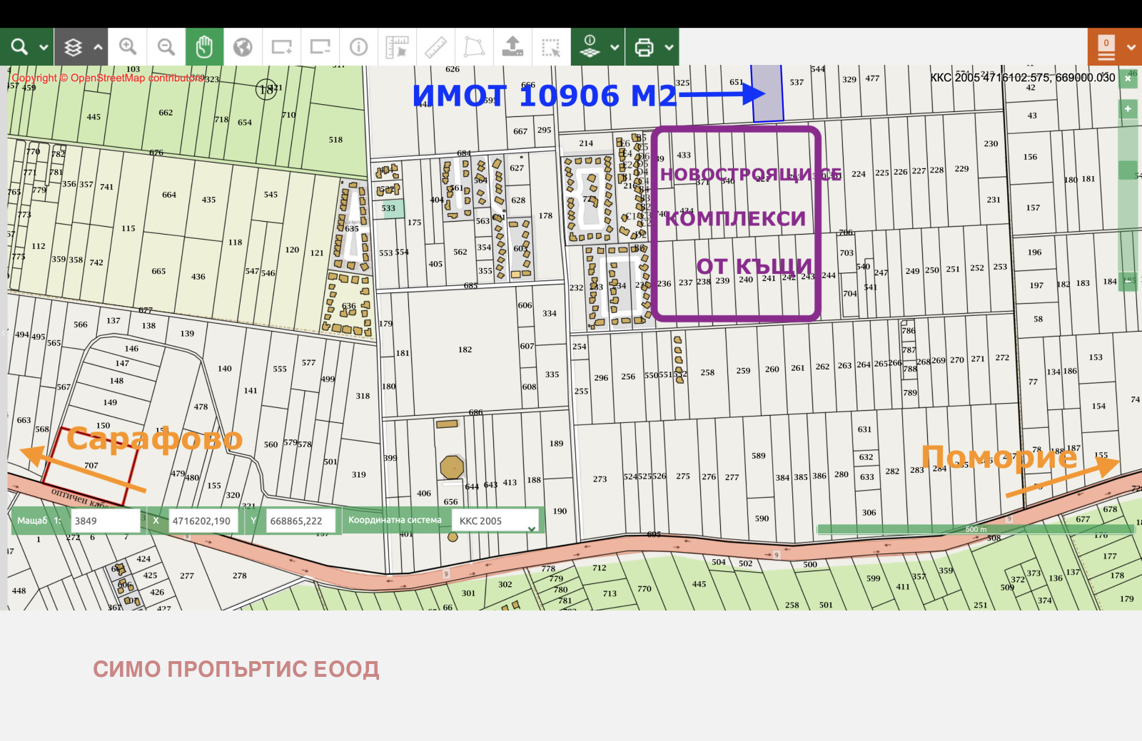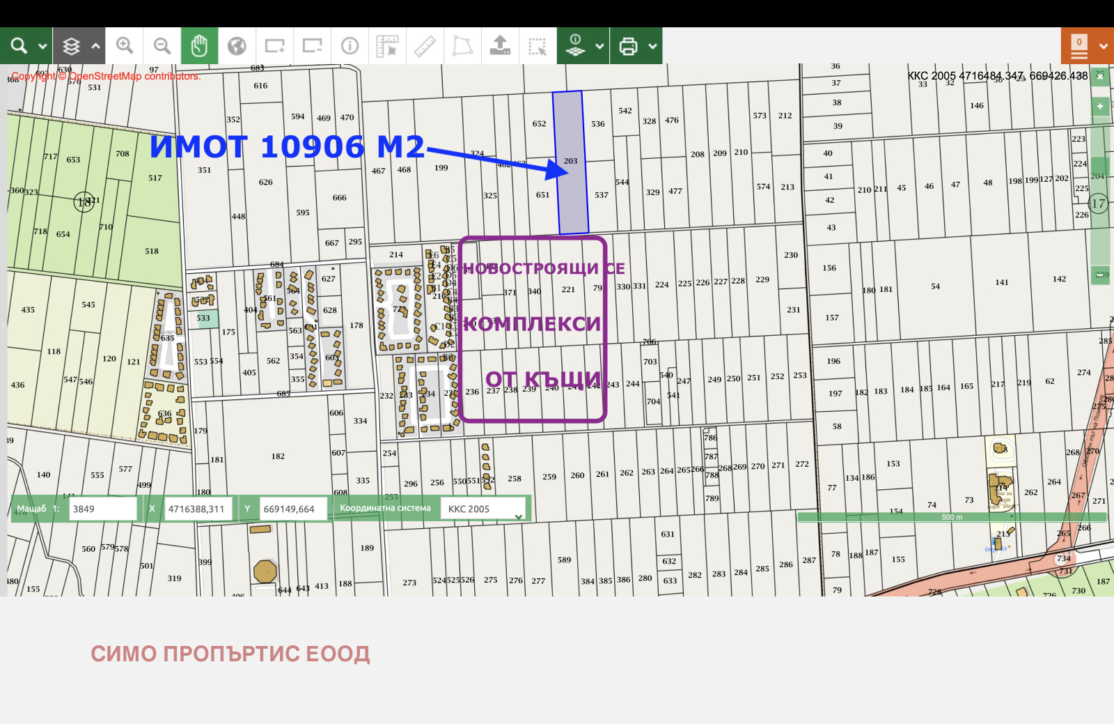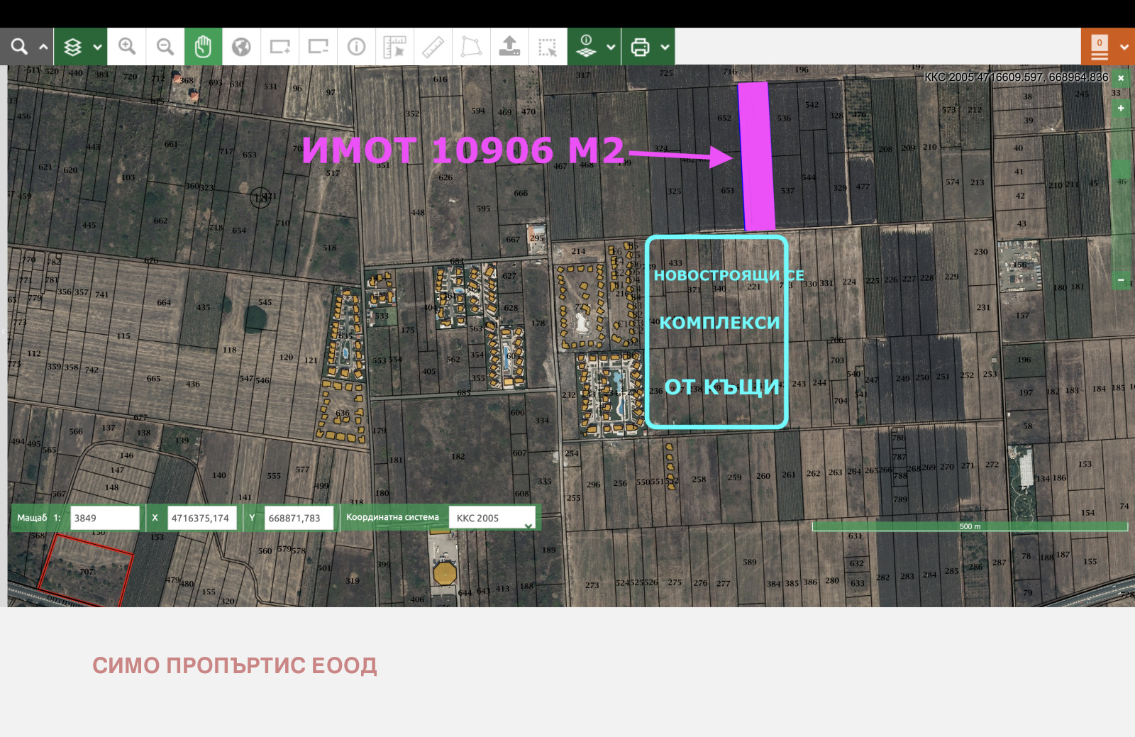 Площа на имота е 10 906 кв.м. Попада в застроителна зона Жм . Показателите на застрояване на парцела са следните: