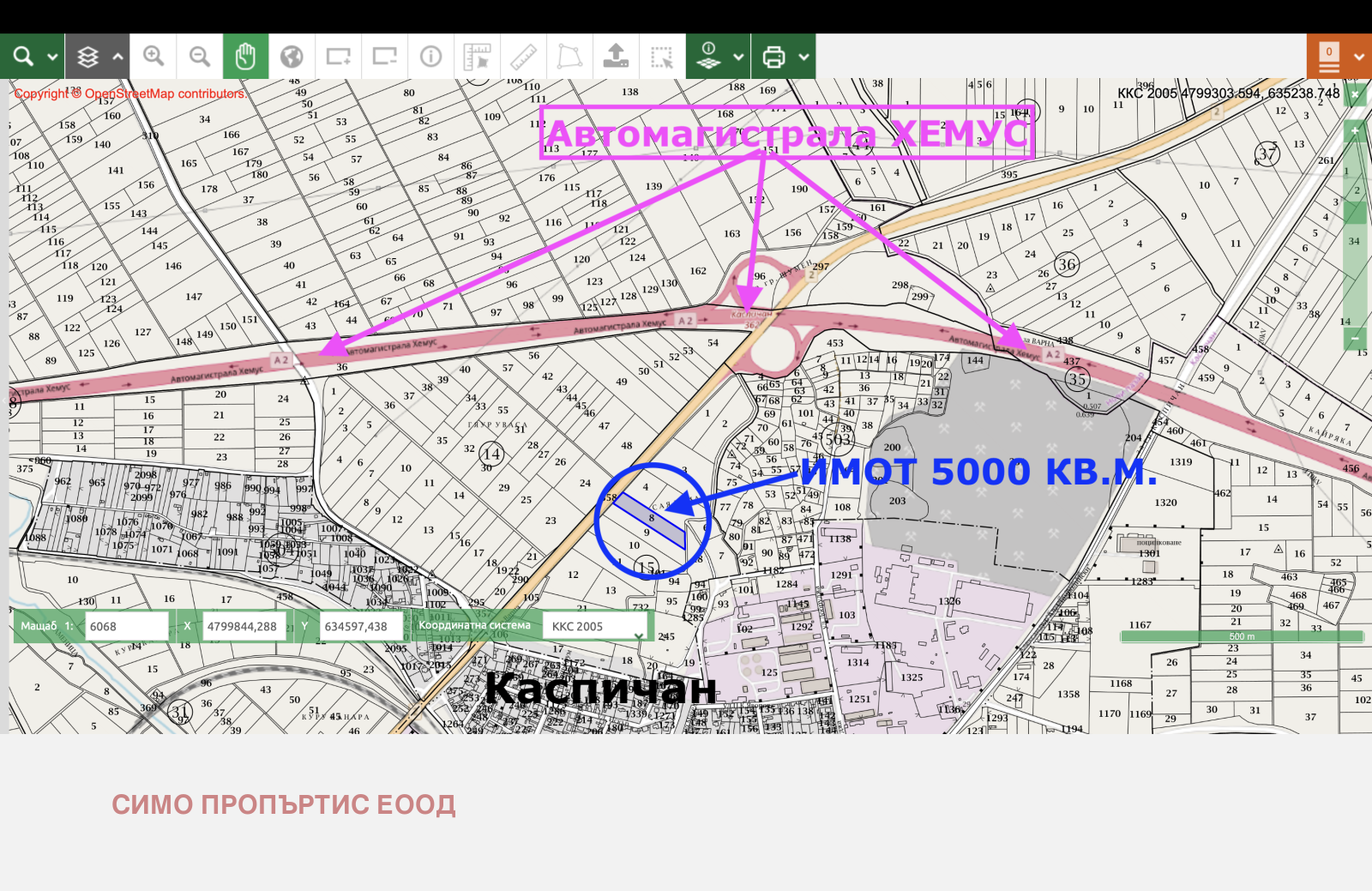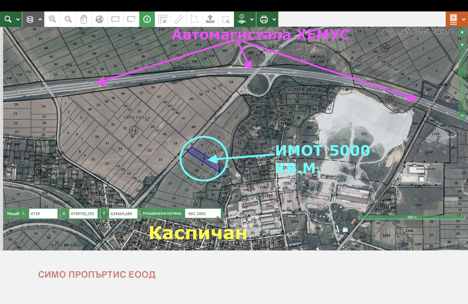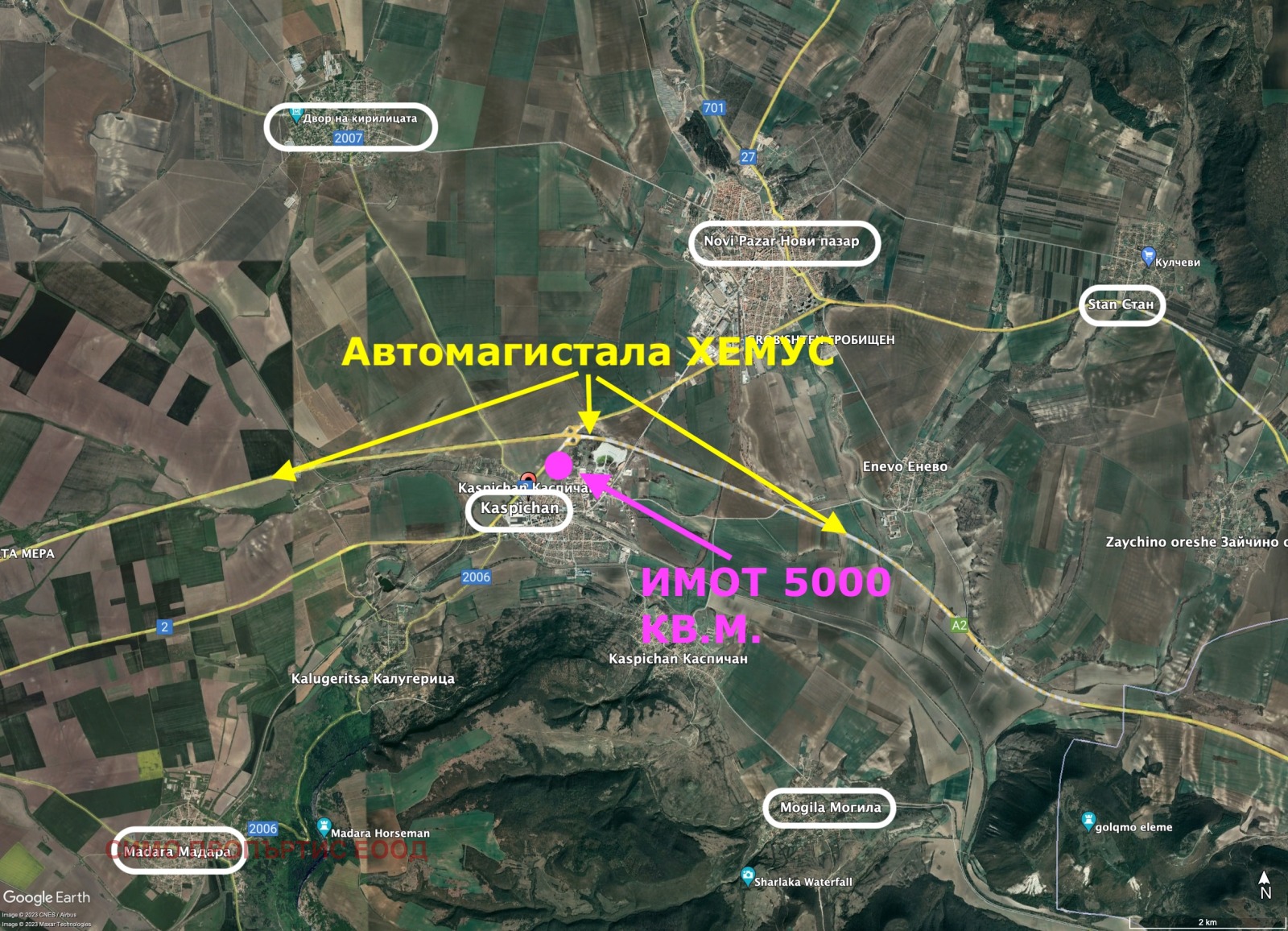 Продава се имот с площ 5000 кв.м.. Имотът административно се намира в землището на Каспичан, обл. Шумен. Намира се на около 300 разстояние от Автомагистрала ХЕМУС и на около 350 метра от гр. Каспичан. Освен за собствено ползване този имот е много подходящ и за инвестиционни цели поради, наличието на лице на главния асфалтов път, близостта му до гр. Каспичан и лесния и бърз достъп от и до магистрала ХЕМУС от дете посоки (към Варна и към София). Имотът е подходящ за изграждане на паркинг, склад, представителство, автосервиз, обслужваща сграда, малка фабрика и др. От задната страна имотът граничи с регулацията града и изградените и съществуващи производствени предприятия. Най-близките точни за присъединяване към електрическата мрежа и вода са на около 150 метра разстояние от имота. Собствеността е безупречна с един собственик. Запознати сме с цялата история от придобиването на собствеността на имота, управлението през годините и сегашния му статут и ситуация. Бихме могли да договорим добри и гъвкави условия за сделка.