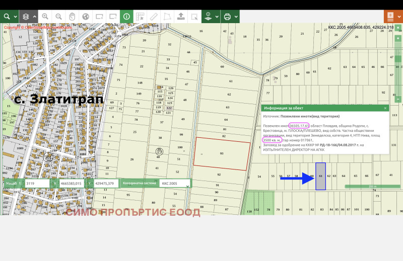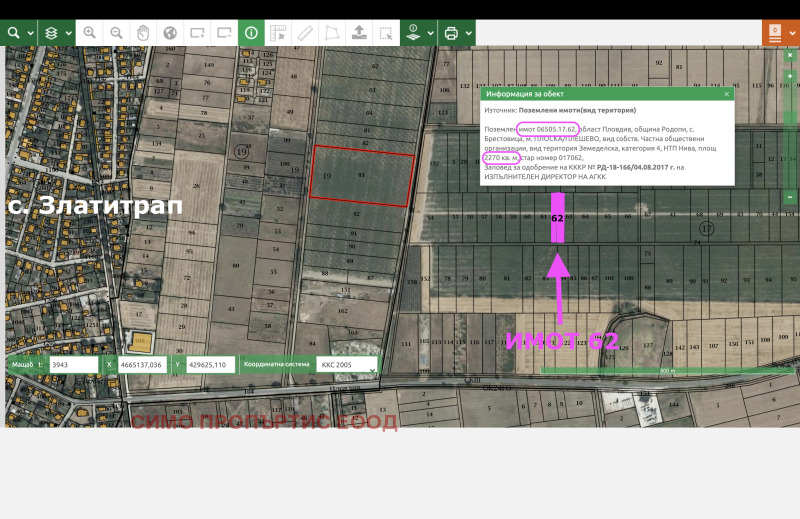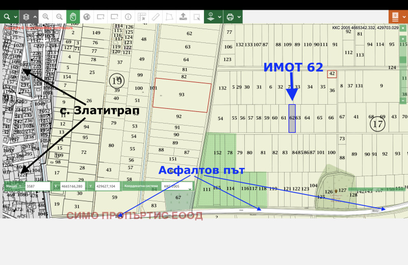 Продават се два имота в с . Златитрап. Имотите са съседни, един до друг, но с различна квадратура. Намиарт се на около три киломентра от кв. Прослав на гр. Пловдив и на около два километра от западната част на околовръстния път на Пловдив. Показателите на застрояване на имотите са: Плътност 60 %, Кинт 1,2, Етажност до три етажа. Единият имот 62 е с квадратура 2270 кв.м.. Другият имот 61 е с квадратура 3500 кв.м. Имотите се продават заедно и по отделно на цена 11 евро/кв.м. Една от въазможните персепективи е имотите да се разделят на по-малки УПИ-та и те да се уползотворят по най-различен начин. Имотите са много подходящ за покупка с инвестиционна цел поради бързото развитие в района, увеличения итерес от купувачи и покачването на цените на имотите за жилиюно, търговско и индустриално строителство. Запознати сме с цялата история и на двата имота от придобиването на собствеността им, управлението им през годините и сегашния им статут и ситуация. Агенцията ни се намира в пряк контакт със собственика на имотите и бихме могли да договорим добри и гъвкави условия за сделка.