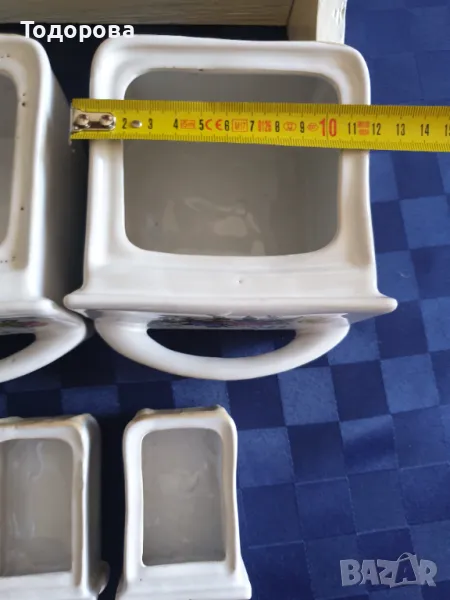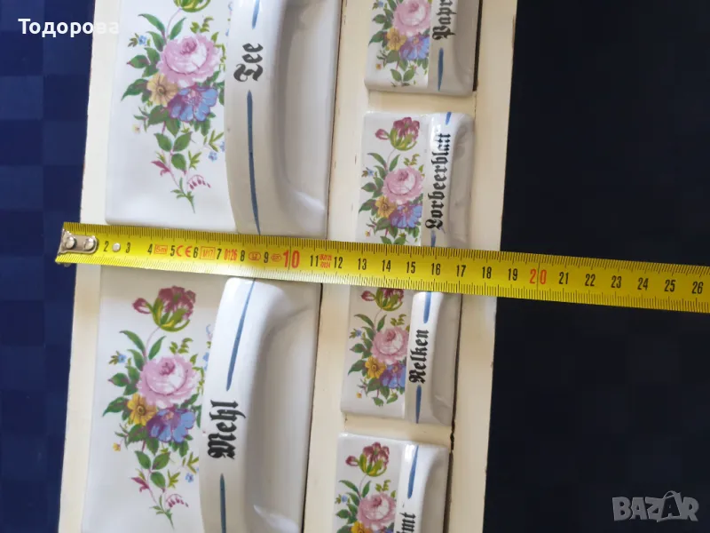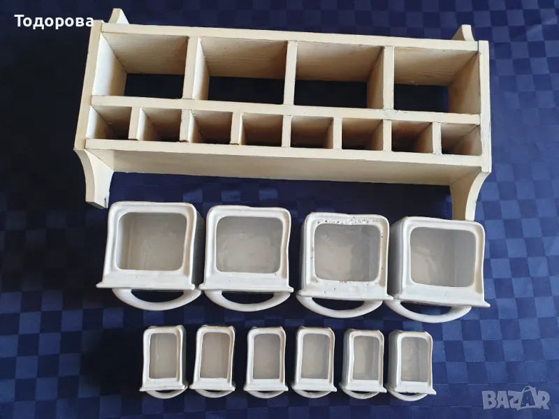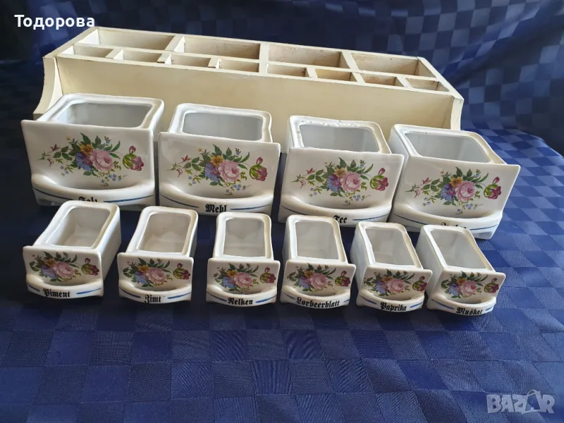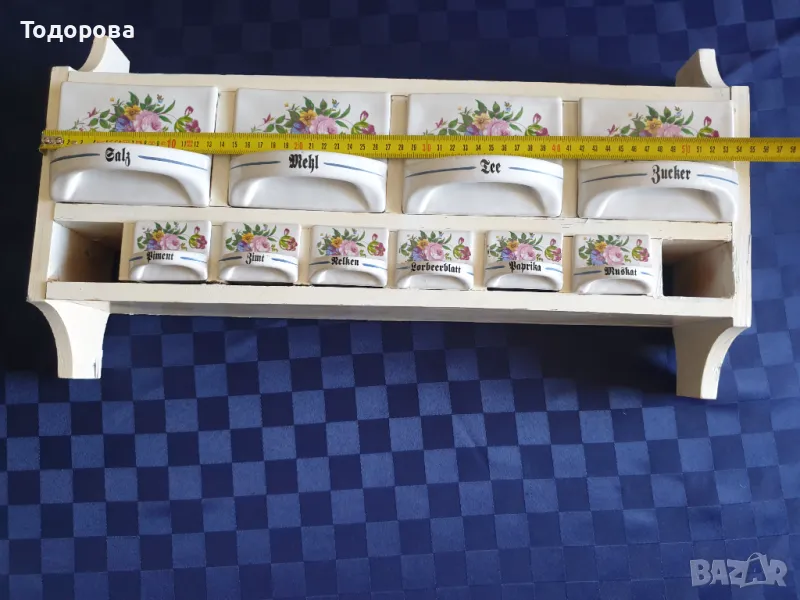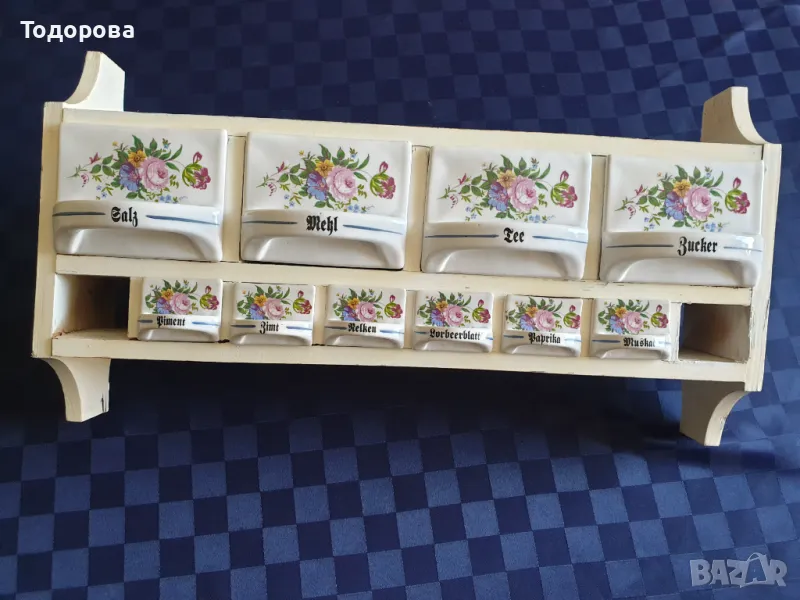 -Старинно шкафче за подправки с порцеланови чекмеджета- 10 броя.Без забележки по порцелана,вероятно липсват 2 броя,в двата края или са ниши.