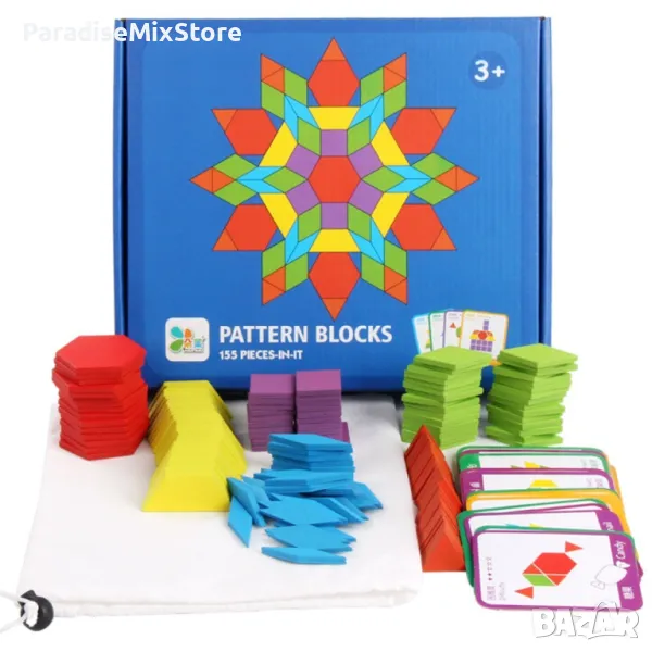 Детски дървен пъзел с геометрични форми от 155 части / Общ брой на частите: 155 броя; Брой на ромбове (сини): 30 броя; Брой на шестоъгълници (червени): 15 броя; Брой на квадрати (лилави): 30 броя; Брой на квадрати (зелени): 30 броя; Брой на триъгълници (кафеви): 30 броя; Брой на четириъгълници (жълти): 20 броя; Брой на картите с помощни изображения: 24 броя; Размер на продукта: 21 x 25 х 4 см; Тегло: 400 гр.