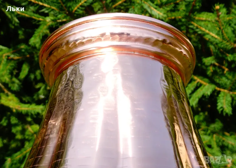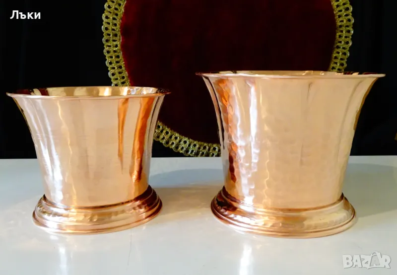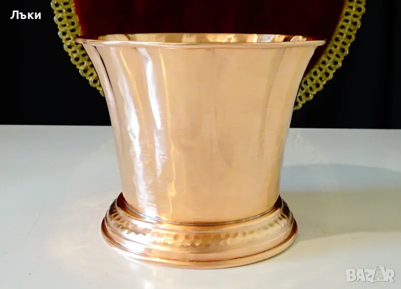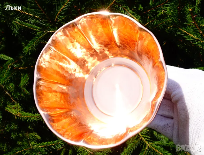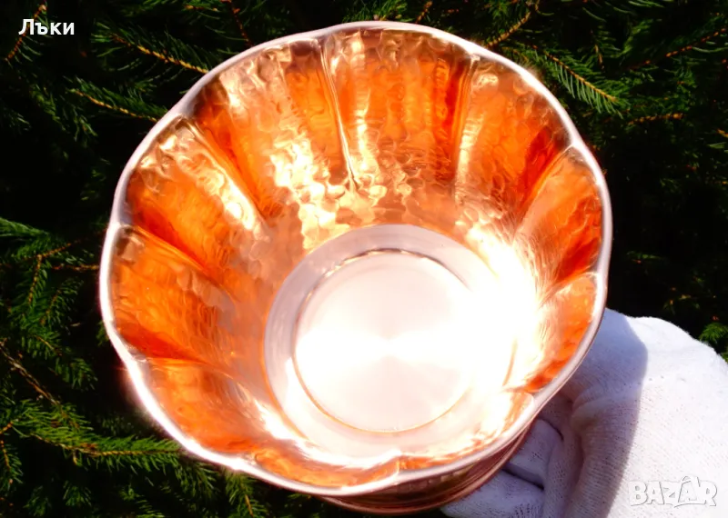 ръчна изработка от чиста червена мед.Кована с красив релеф и ослепителен блясък.От вътре не е калайдисана.Подходяща и като съд за медна вода.Височина 10 см.,диаметър 12.5 см.,тегло 190 гр.Вместимост 400 мл.