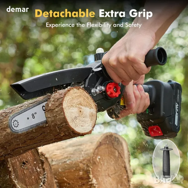 8-инчовият мини верижен трион предлага мощно рязане за по-голяма дървесина, идеален за взискателни задачи. С тегло само 1,45 кг, той е проектиран за лесно боравене, идеален за възрастни хора и жени. Безчетковият мотор осигурява 1000 W мощност с тиха работа от 50 dB, минимизирайки шумовото въздействие. Оборудван с две батерии от 2000 mAh и две вериги, той осигурява непрекъснато рязане без прекъсване. Вградената система за автоматично смазване подобрява ефективността, а подвижната дръжка предлага гъвкави опции за захващане. Функциите за безопасност включват защитен превключвател, предотвратяване на пръски от дърво и включени очила и ръкавици за защита.