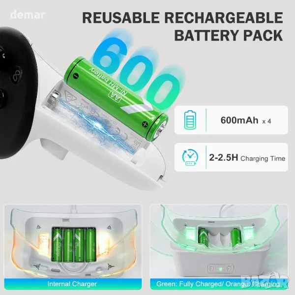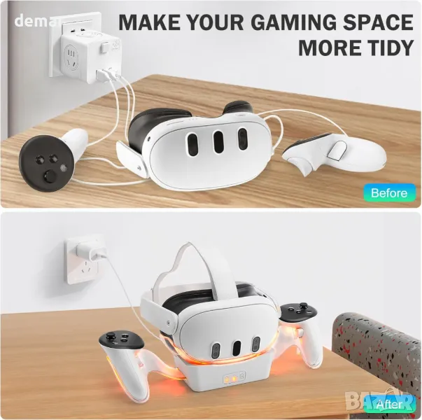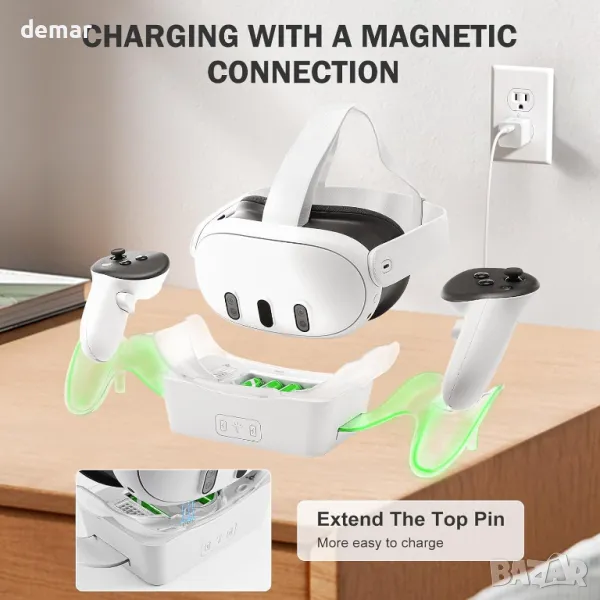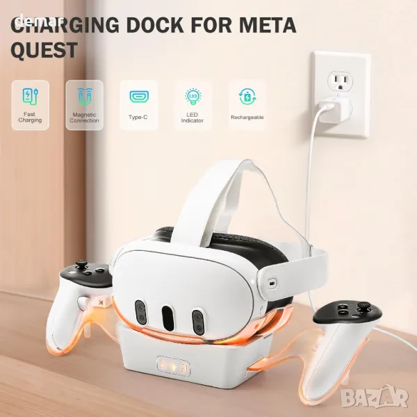 Тази станция за зареждане, предназначена за Quest 3, разполага с магнитна засмукваща система за VR слушалките и включва четири акумулаторни батерии за бърза смяна. Може да зарежда слушалките и батериите едновременно или поотделно, с време за зареждане от 3 часа за слушалките и 2 часа за батериите. Компактният дизайн функционира и като стойка за VR, спестявайки място, като същевременно поддържа вашите устройства организирани. Силните магнити осигуряват сигурно и стабилно зареждане, а множеството защити за безопасност предотвратяват прегряване и презареждане. LED индикатор показва състоянието на зареждане, което улеснява наблюдението на напредъка.