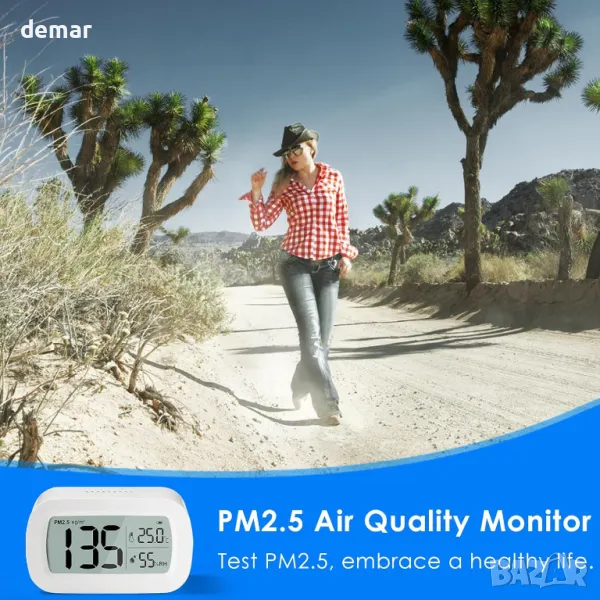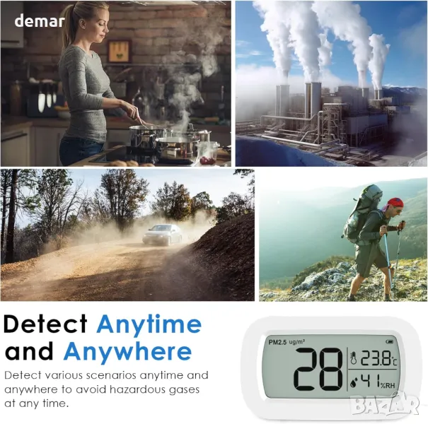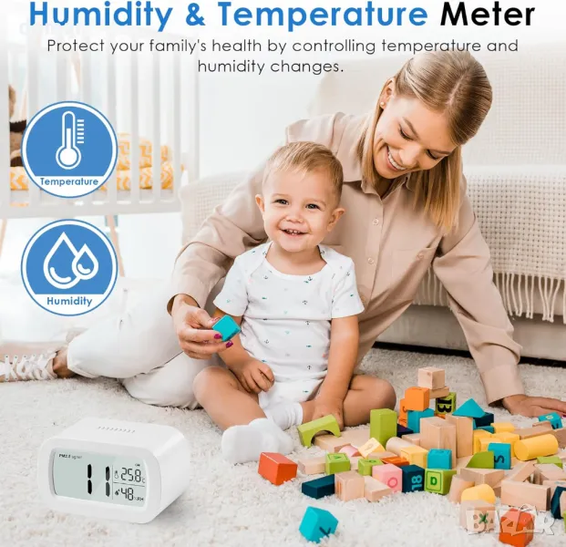 Това устройство 3 в 1 следи PM2,5, влажност и температура за пълна оценка на качеството на въздуха в затворени помещения. Той осигурява точни отчитания на PM2.5 в реално време, отчита температура (с точност ±1°C) и влажност (20-95% с точност ±5%) и може да превключва между Фаренхайт и Целзий. Той предлага две опции за захранване - USB или AAA батерии - и автоматично се изключва след 10 минути, за да пести енергия. Идеален за употреба както на закрито, така и на открито, мониторът е лесен за използване с управление с един бутон.