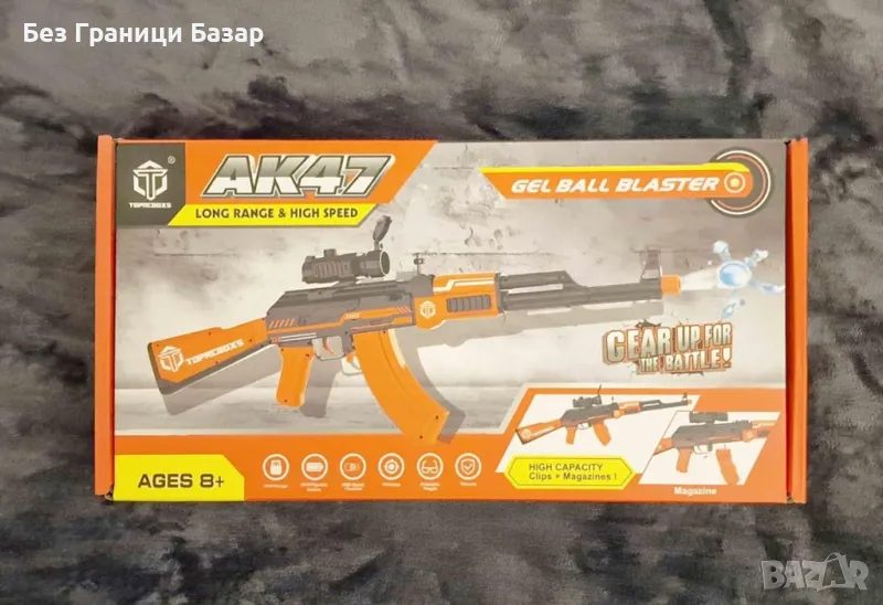 Комплект за стрелба: Включва гел бластер, 50000 гел топчета, 2 барабана, мерник, очила и електронна мишена.