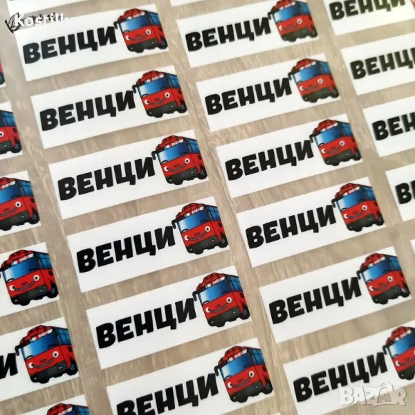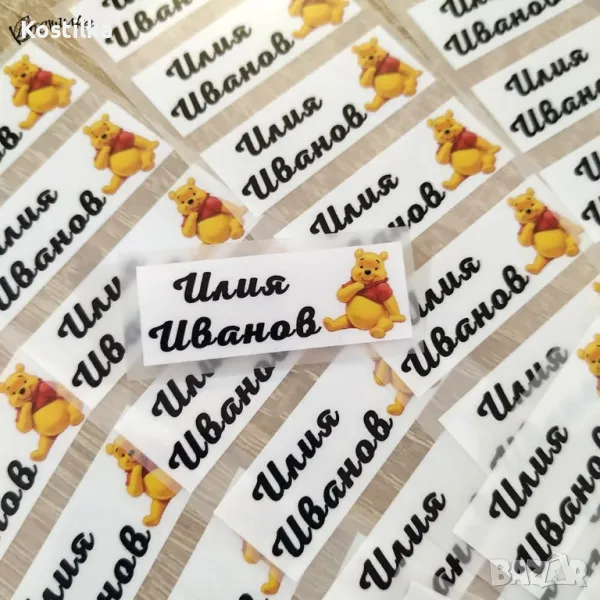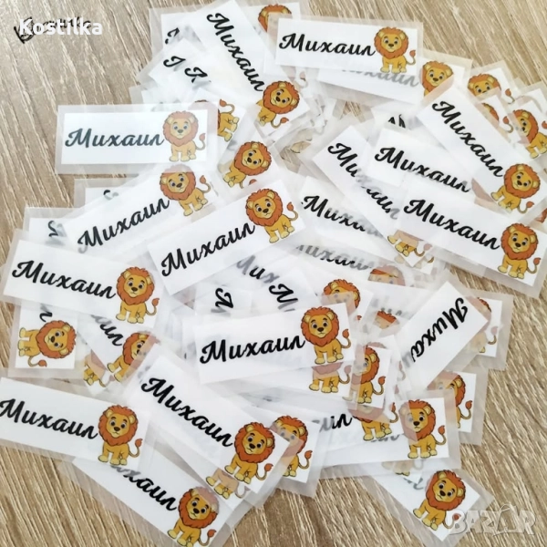 Термо стикери за залепване с ютия - могат да бъдат с едно или с две имена и картинка по желание. Има избор и от шрифтове. Всеки стикер е с размери 36 mm х 14 mm.
