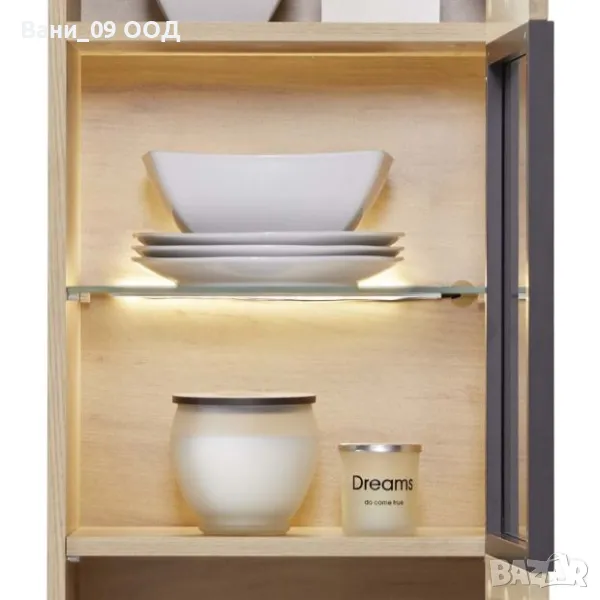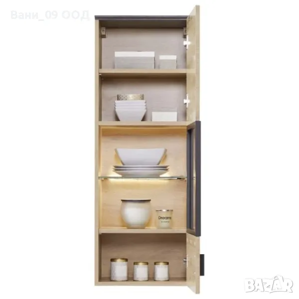 стъклена витрина, зад която са монтирани четири рафта. Голямо предимство на шкафа са пантите с механизъм за безшумно затваряне, вътрешната дървесна декорация, както и регулируемите рафтове с макс. товароносимост до 3 кг, за които сами определяте тяхната позиция. Шкафът е с класическа форма, но двуцветната декорация го прави изключително атрактивен. Цялостно е моделиран в светла дървесна текстура, като единствено рамката около витрината със закалено стъкло и горния плот са в стилен черен цвят.