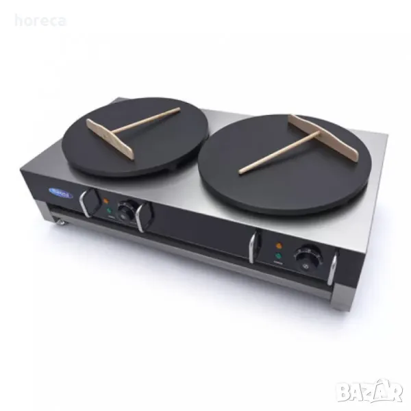 Котлон за палачинки с 2 броя плочи с диаметър 40см. Мощен уред с оптимален топлообмен за бързо приготвяне на големи порции палачинки. Плочата е изработена от чугун, с не залепващо покритие. С регулируемият термостат можете да задавате температури до 300ºC. За да разберете точно кога плочата е достатъчно гореща, има удобен светлинен индикатор. Корпусът от неръждаема стомана се почиства лесно. С гумени крачета за стабилност на плота. С чекмедже от неръждаема стомана за палaчинки. С включени два дървена креп шпатула, така че можете да разпределите тестото добре върху тавата за печене и да получите перфектните палачинки