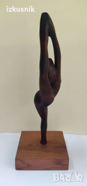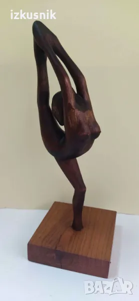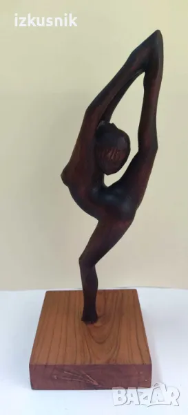 Фина, изящна статуетка от дърво Гимнастичка. На поставка, с авторски инициали. Кой е творецът обаче, не мога да кажа. Фигурата е детайлно изваяна. Създава чувство за грация и красота. Висока е 22 см. С поставката – 24 см. Поставката също е дървена, по-светла от фигурата, с добре изразени жилки.