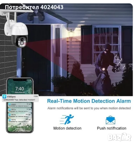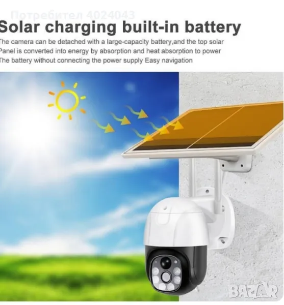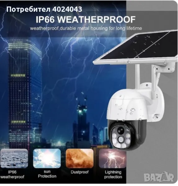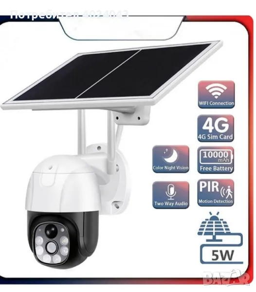 Резолюция: 5MP сензор, Full HD 1080P качество на изображението; Нощно Виждане: Инфрачервена LED технология с обсег до 20 метра; Соларно Захранване: Вграден соларен панел за автономно захранване; Свързаност: Wi-Fi (802.11/b/g) и 4G SIM карта за дистанционно наблюдение и управление; Двупосочно Аудио: Вграден микрофон и говорител за двустранна комуникация; Детектор за Движение: Изпраща известия и записва видео при засичане на движение; Съхранение: Поддръжка на microSD карти до 64GB; Водоустойчивост: IP66 защита, подходяща за външен монтаж.