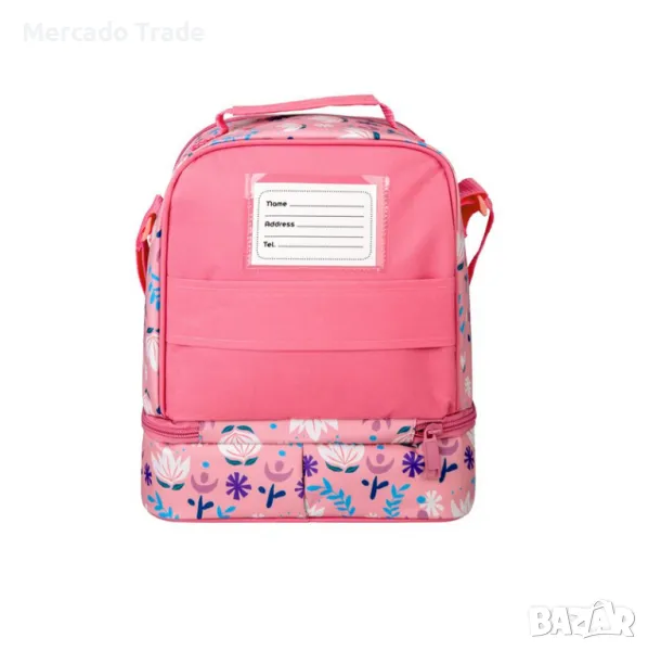 Разполага с 2 места за храна, плодове или закуска на детето и за кърпата или сока.Има дръжка и дълга презрамка, етикет за детайлите на детето и джоб за прикрепяне на чантата за обяд към училищната количка или куфар.