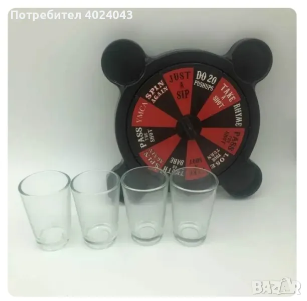 Забавна алкохолна игра РулеткаС тази забавна алкохолна игра "Рулетка" всяко събиране ще се превърне в незабравимо преживяване, изпълнено с много смях и приятни моменти. Лесната ѝ употреба и издръжливите материали я правят чудесен избор за всяка компания.Добавете повече забавление и вълнение към вашите партита със забавната алкохолна игра "Рулетка"! С диаметър на рулетката от 30 см и изработена от висококачествени материали като пластмаса и стъкло, тази игра е идеална за всяко събиране. Правилата са изключително прости: завъртете черната стрелка, изпълнете действието, което ви се падне – изпийте чаша, пропуснете ход или завъртете отново! Комплектът включва 4 стъклени чаши, което я прави идеална за малки групи. Осигурете си незабравими вечери с много смях и приятни моменти с тази уникална игра.