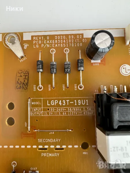 Power Board EAX68304102(1.0) / EAY65170108 / LGP43T-19U1 от телевизор LG 43UP751C0ZF. Платката е работеща свалена от работещ телевизор със счупен дисплей модел на дисплея HC430DQG-SLXL1-A14X. Изпращам по ЕКОНТ с опция тест и преглед!!! С оглед и проба на това, че модулите нямат гаранция, след прегледа, теста и заплащането не приемам възражения и ракламации, щото предварително всички платки и модули са тествани и в изправно състояние се пращат!!!